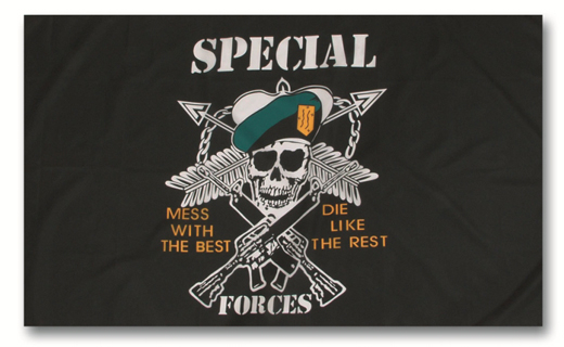 in poliestere 100 % mess whit the best die like the rest bandiera propagandistica berretti verdi (forze speciali) dotata di una coppia di anelli metallici lato anelli bordata con tessuto di rinforzo dimensioni 90x150 cm