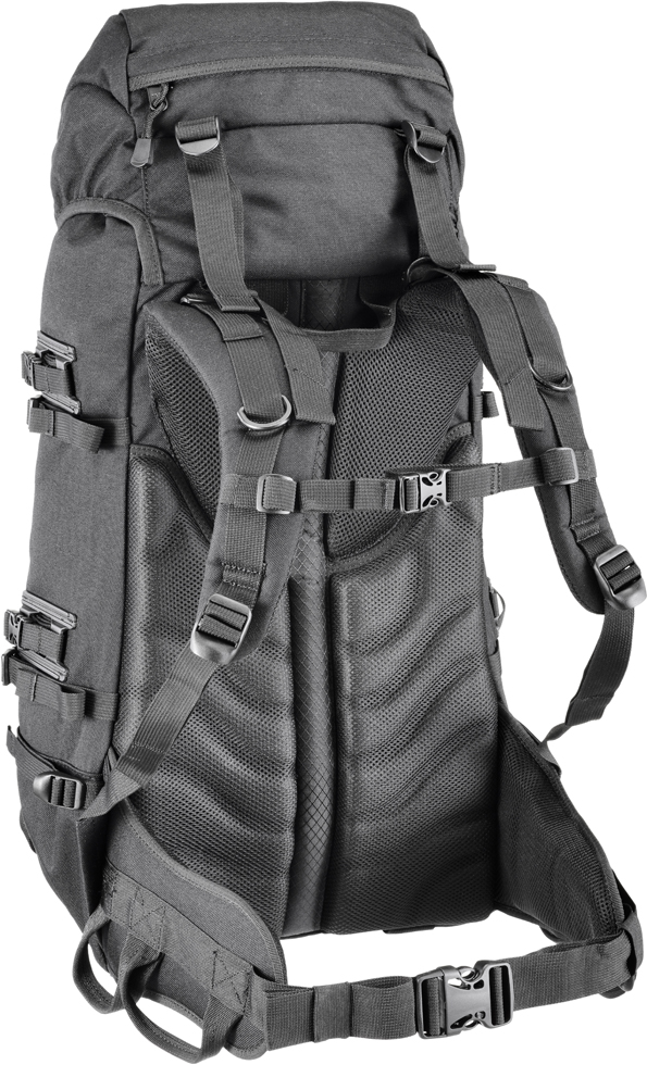 Barra alluminio 6061-T6 centrale/verticale – Paleria in vetroresina: si tratta di paletti diagonali incrociati all’interno dello schienale (a supporto e flessibilità di tutta l’area dello stesso), racchiusi dentro il sistema schienale e accessibili dall’interno dello zaino aprendo il nastro a strappo+cerniera dello scompartimento principale. – Cuscinetti imbottiti anatomici: sono a struttura differenziata e costituiti dalla combinazione di schiuma di Poliuretano (PU FOAM open cells) a cellule aperte e schiuma EVA (EVA FOAM close cells) a cellule chiuse. – Aree di contatto: sono ricoperte da un doppio strato di AIR MESH traspirante e piacevole al contatto (SANDWICH AIR MESH). Inoltre, i rilievi e bassorilievi creano le condizioni per una piacevole circolazione d’aria (canali di areazione e anatomia). La barra di alluminio centrale verticale, essendo incavata nello schienale, non preme mai sulla spina dorsale del portatore. – Spallacci: di forma a “S” anatomica e con imbottitura confortevole “ammortizzante” è antischock. Stabilizzatori e regolatori spallacci. – Cintura a vita: importante, fasciante, morbida e anatomica all’interno, rigida e robusta all’esterno