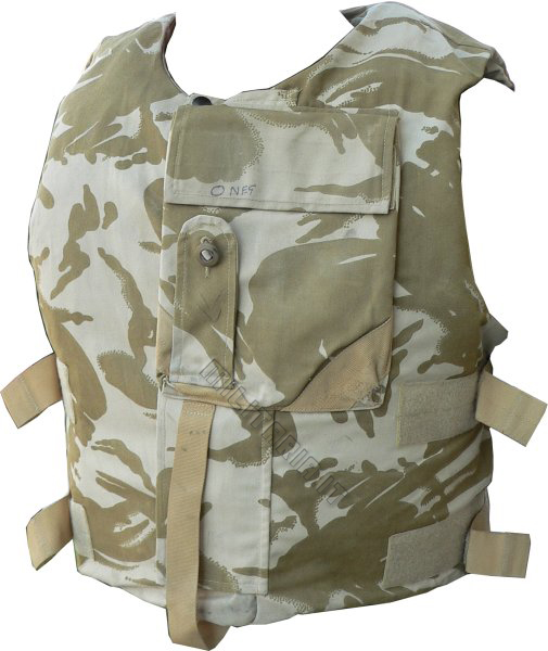Gilet antischeggia originale Esercito Inglese Distruptive Pattern Model Di libera vendita in quanto il tessuto balistico è stato rimosso Strappi a nastro a strappo sui lati per adattarlo bene al corpo 2 tasche una sul petto ed un altra sulla schiena per l'inserimento di tavolette balistiche aggiuntive Privo di piastre interne Le taglie fanno riferimento all'altezza e al girotorace