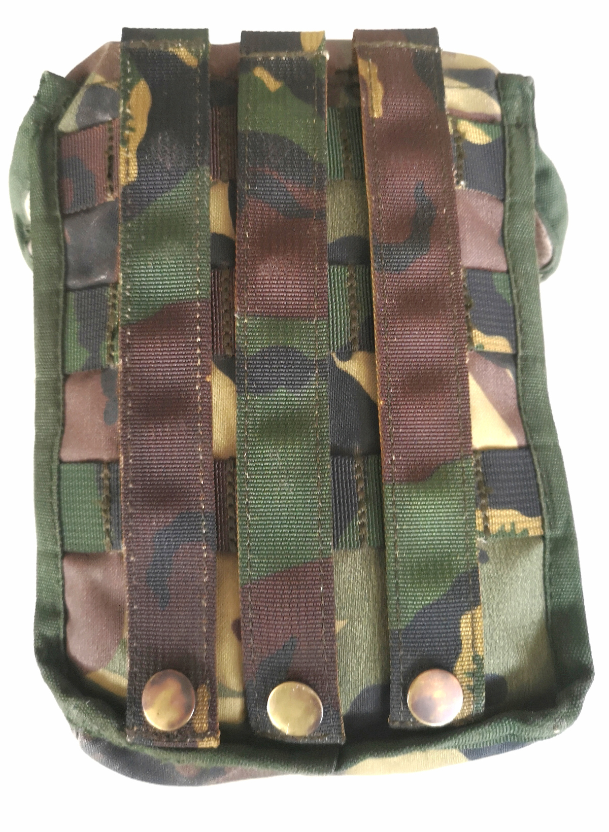usata prima scelta custodia in cordura da 280 gr ( polyamide gecoat polyurethaan ) particolare tessuto molto leggero apertura a moschettone in polimero nero mimetismo DPM attacchi M.O.L.L.E. (Modular Lightweight Load-carrying Equipment.) foro anellato metallico sul fondo di svuotamento peso 450 gr