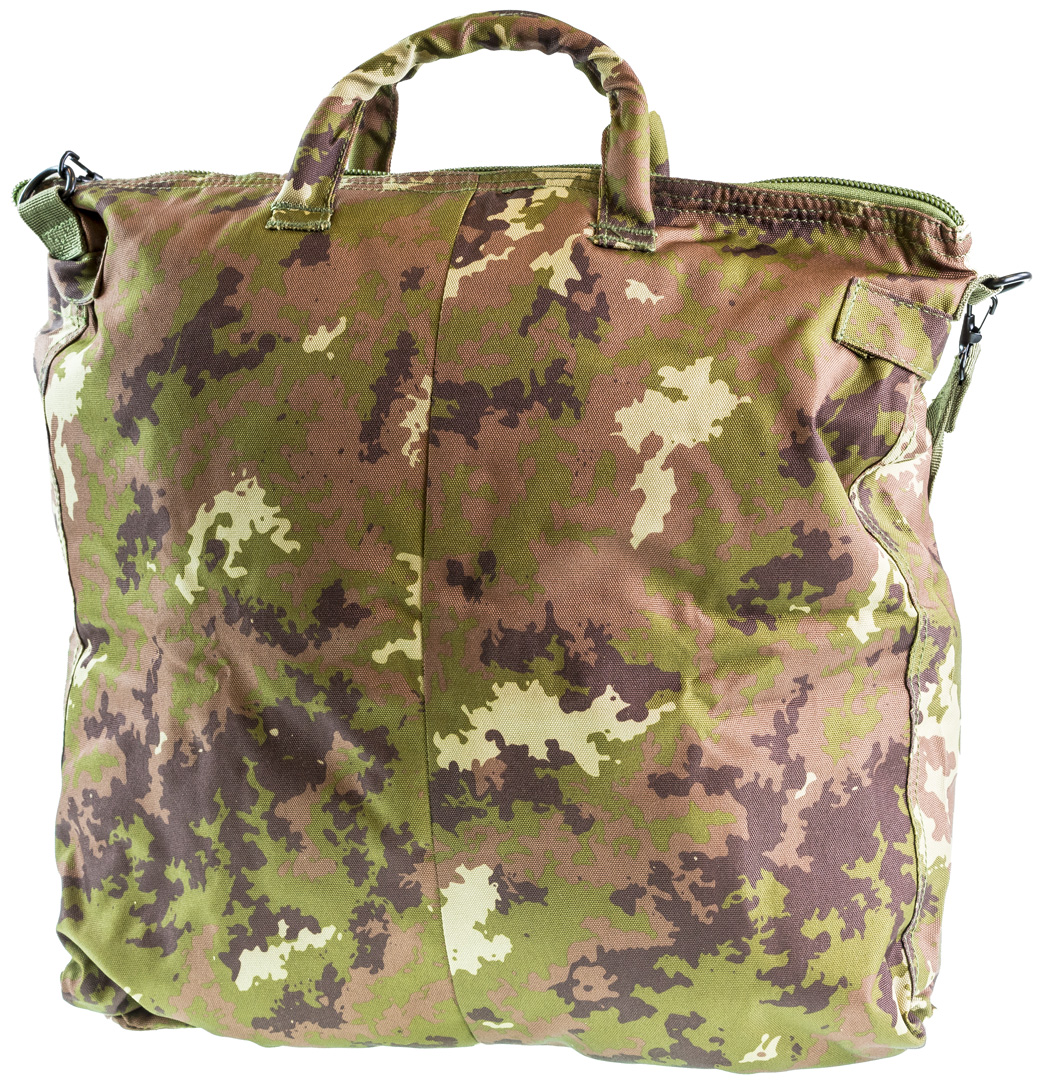 BORSA PORTACASCO VEGETATA In cordura Tracolla amovibile inclusa 5x120 cm Maniglie di trasporto imbottite Moschettone metallico nero esterno Chiusura a zip Chiusura tasconi con bottoni automatici altezza 45 cm lunghezza 38 cm Profondità: 10 cm Dimensioni tasconi 21x35 cm Dimensioni tasche interne 24x16 cm