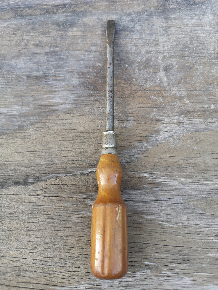 Cacciavite Regio esercito per automezzi nuovo residuo di magazzino Impugnatura in legno verniciato Punta a taglio Fermo in alluminio con piccolo Rivetto Le condizioni sono eccellenti sembrerebbe mai utilizzato a giudicare dalla verniciatura del legno la parte metallica presenta tutti i segni del tempo Probabilmente è stato a lungo in qualche deposito di automezzi in quanto risulta essere un cacciavite in dotazione alla cassetta attrezzi dei mezzi militari del Regio esercito lunghezza totale 25 cm