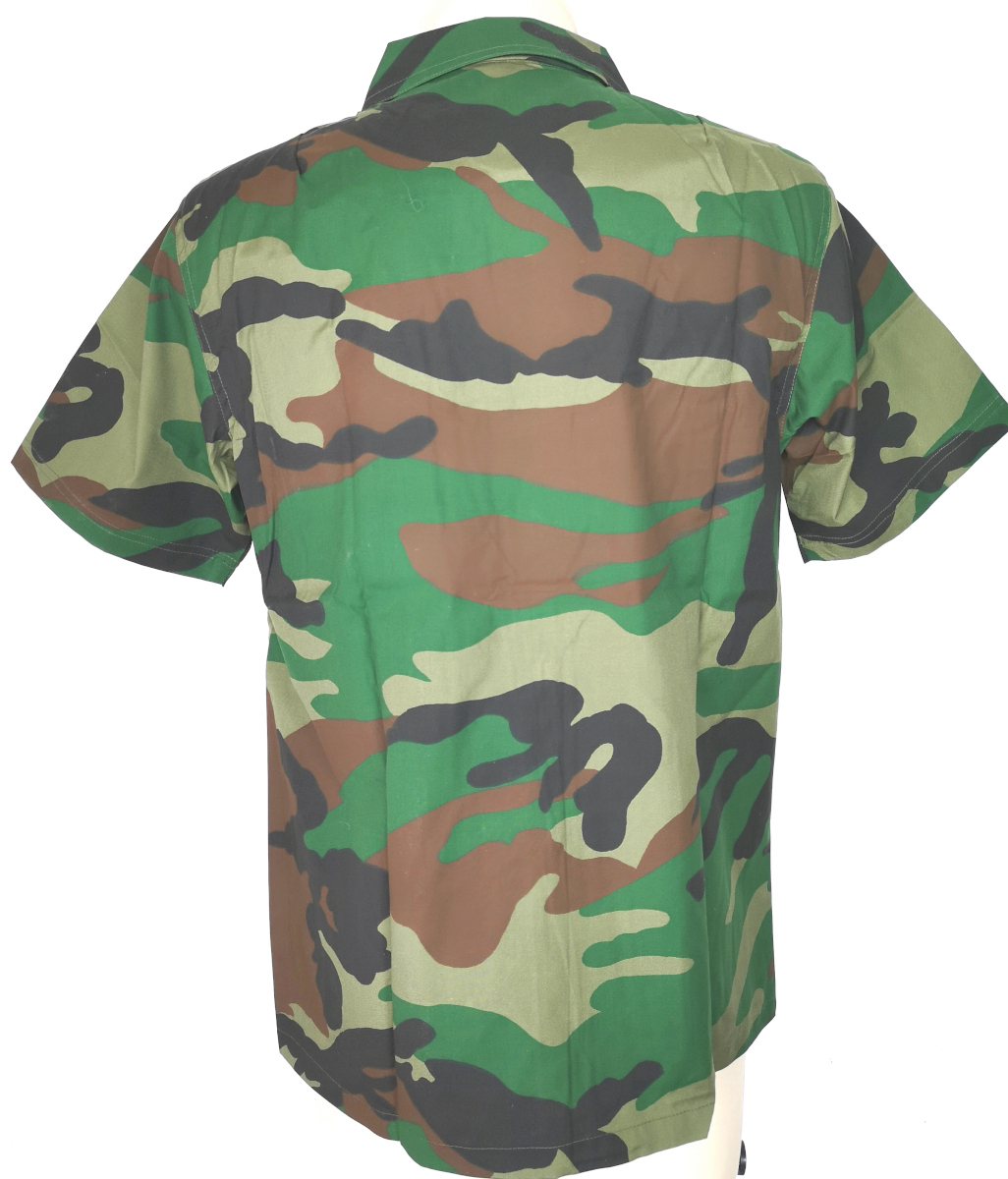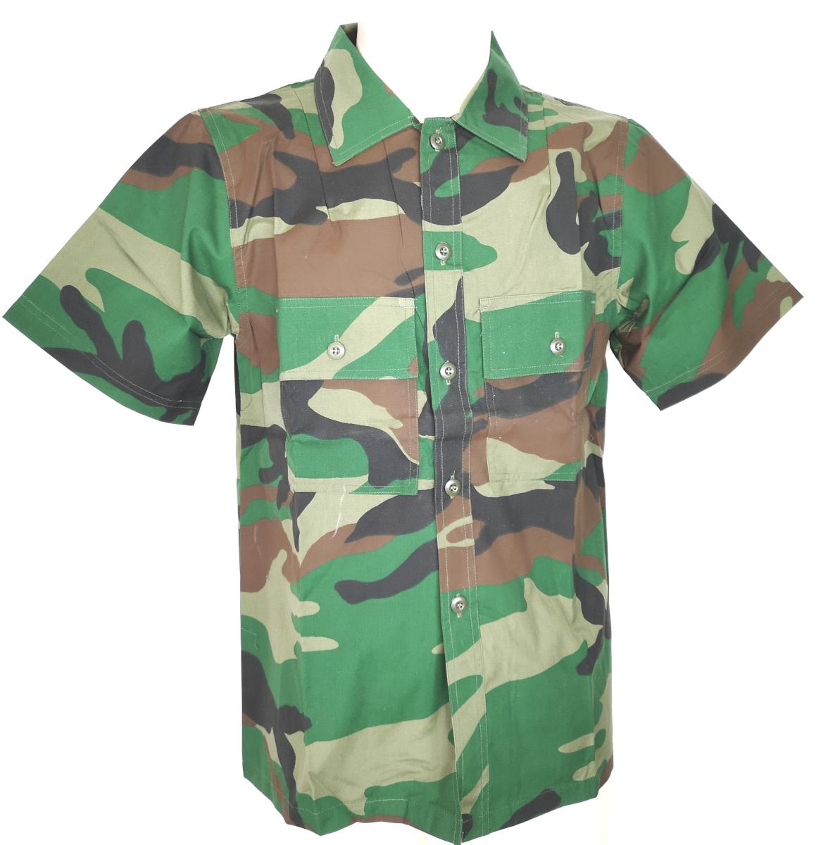 Manica Corta 65% poliestere 35% cotone tessuto resistente media pesantezza colore policromo woodland da uomo articolo nuovo modello manica corta da uomo vestibilità ampia colletto morbido 2 taschini frontali chiusi da bottone Large 108 cm giro torace peso 240 gr