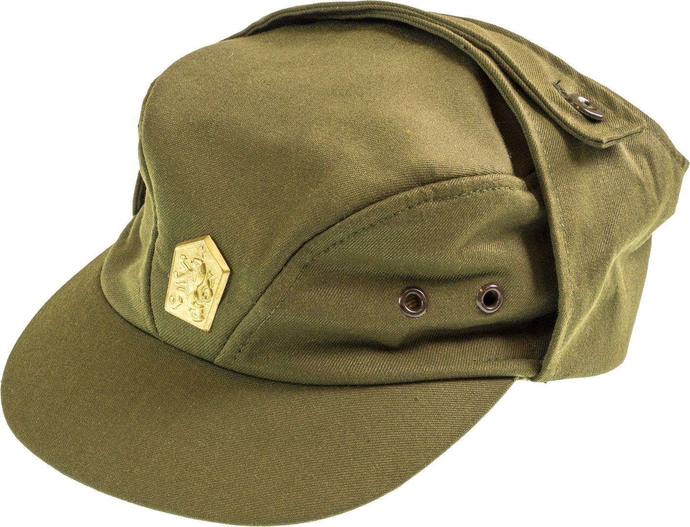 Cecoslovacco M60 con fregio ceskoslovenska socialisticka republika cssr ex patto di Varsavia anni 1980 originale nuovo fregio originale metallico totalmente impermeabile traspirante visiera semirigida 4 fori di areazione due per lato con occhielli metallici per uniforme invernale ordinaria prodotto in Cecoslovacchia tessuto misto sintetico esternamente foderato internamente spessa tela di cotone interna bordatura interna colore verde kaki loghi e timbri originali al suo interno si sbottona e si tirano giu le falde per utilizzarlo con paraorecchie