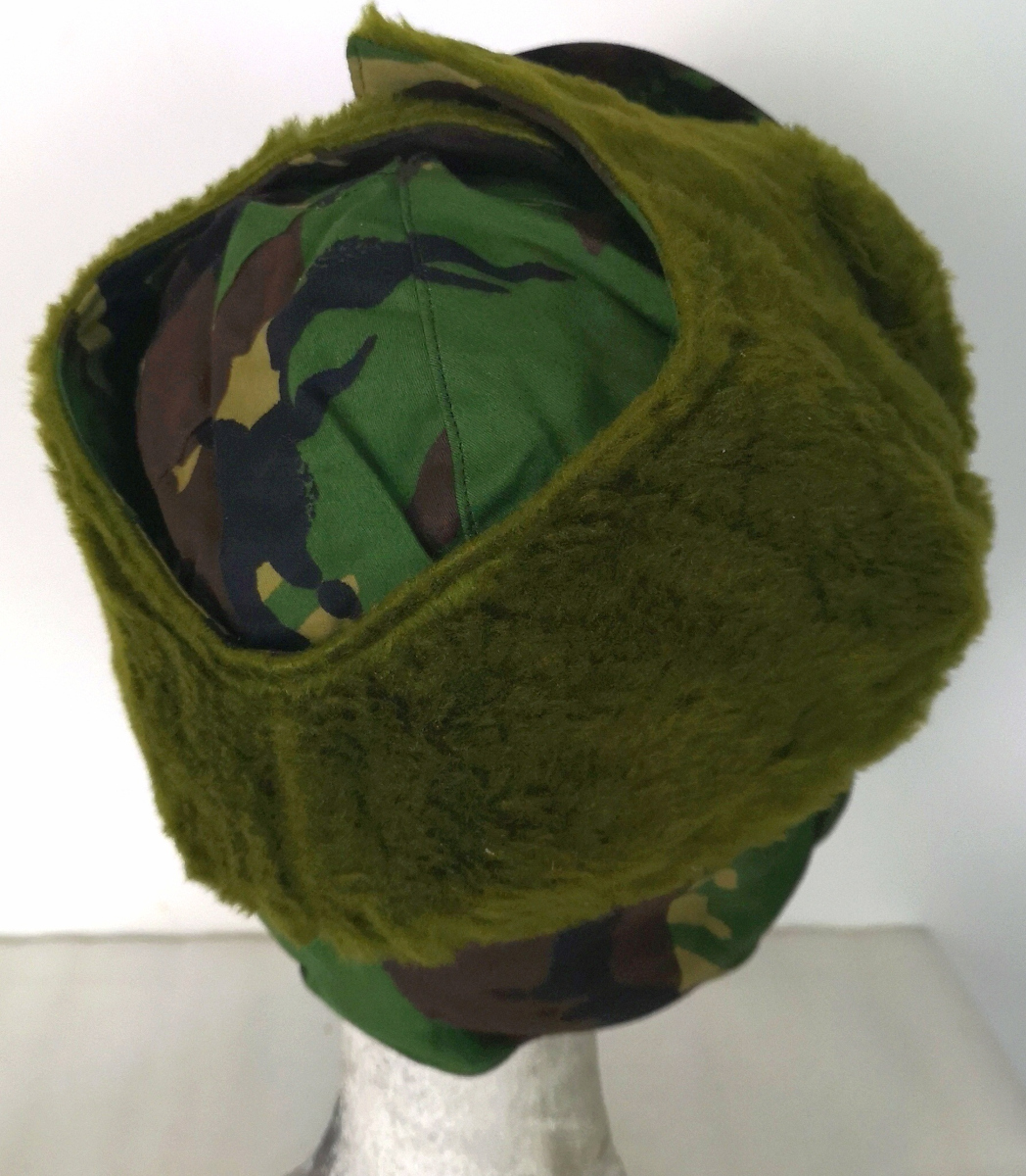 Cappello originale ex dotazione dell'Esercito Inglese nuovo fabbricato in Inghilterra pelliccia sintetica verde modello invernale "Winter Cap un classico cappello dell'epoca della guerra delle Falkland Cold Weather colorazione DPM (Disruptive Pattern Model ) Forze Armate Britanniche. esterno interamente in tessuto impermeabilizzato realizzato in gabardina di cotone antivento SAS / artic smock interno foderato imbottito visiera semirigida paraorecchie utilizzabile al bisogno come in foto nastro a strappo sul mento per chiuderlo peso 145 gr