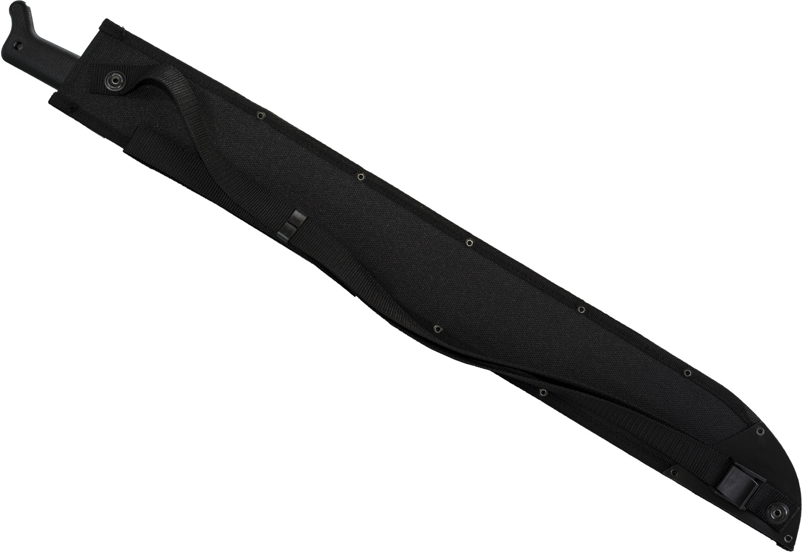 Impugnatura a due mani Lama in carbonio 1055 antiruggine Impugnatura zigrinata in robusto polimero nero antiriflesso con foro passante per cordino Fodero in cordura nera Tracolla regolabile in cordura nera Lunghezza Lama 535mm Spessore Lama 2mm Lunghezza Totale 770mm Peso 590 grammi