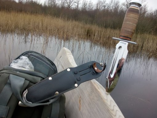 prodotto in Italia pomolo in acciaio satinato foro per cordino sul paramano puntale fodero rinforzato in metallo inox 4 bulloni di rinforzo per fodero Lama in acciaio inox 440 C (150 mm) Lunghezza totale 270 mm Manico in cuoio pressato Peso 270 gr Fodero in cuoio privo di scritte Note:Il coltello ex dotazione dei piloti dell'Aeronautica Militare Italiana