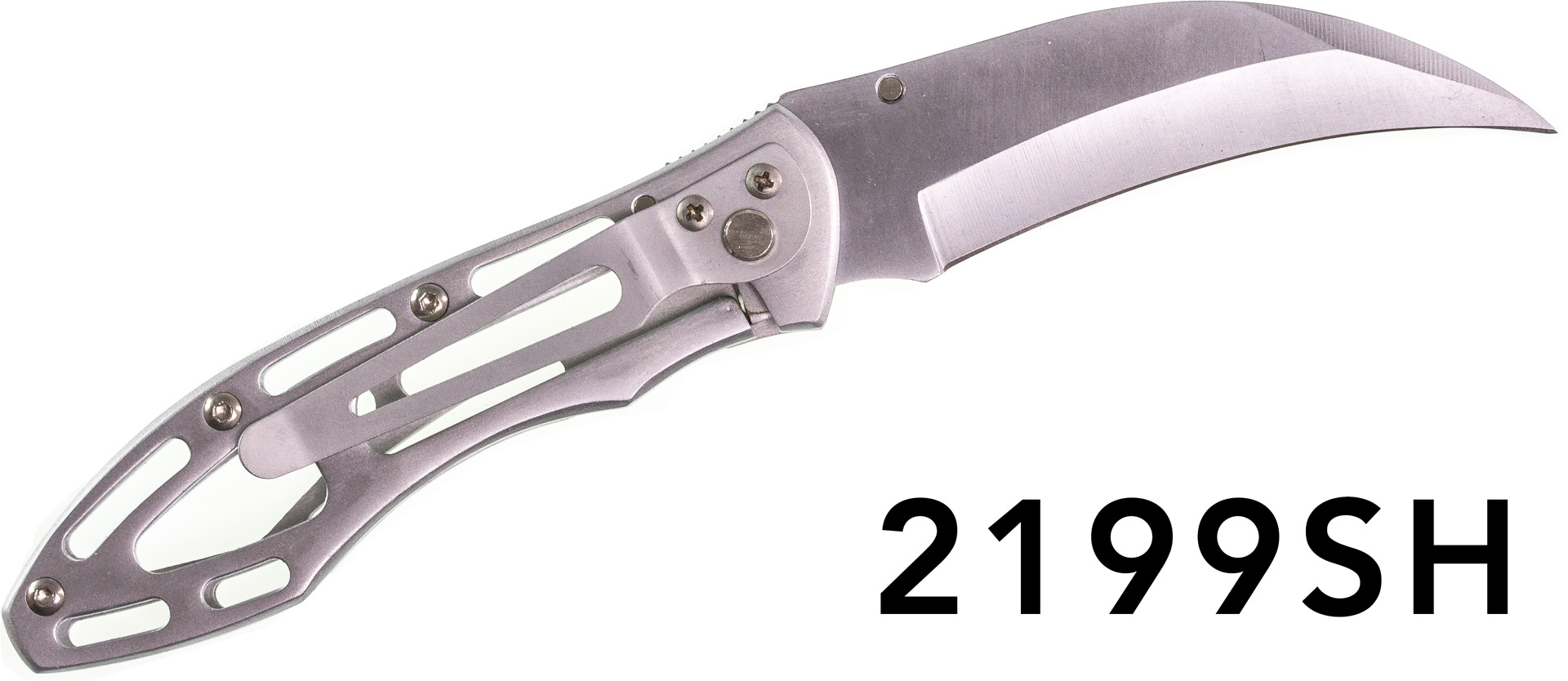 Coltello lama curva Chiudibile manico Alluminio confezione da 6 pezzi 2198SH Clip metallica per agganciarlo alla cintura Acciaio della Lama: 420 Stainless Materiale Manicatura Alluminio Lunghezza della Lama: 95mm Lunghezza Totale: 215 mm