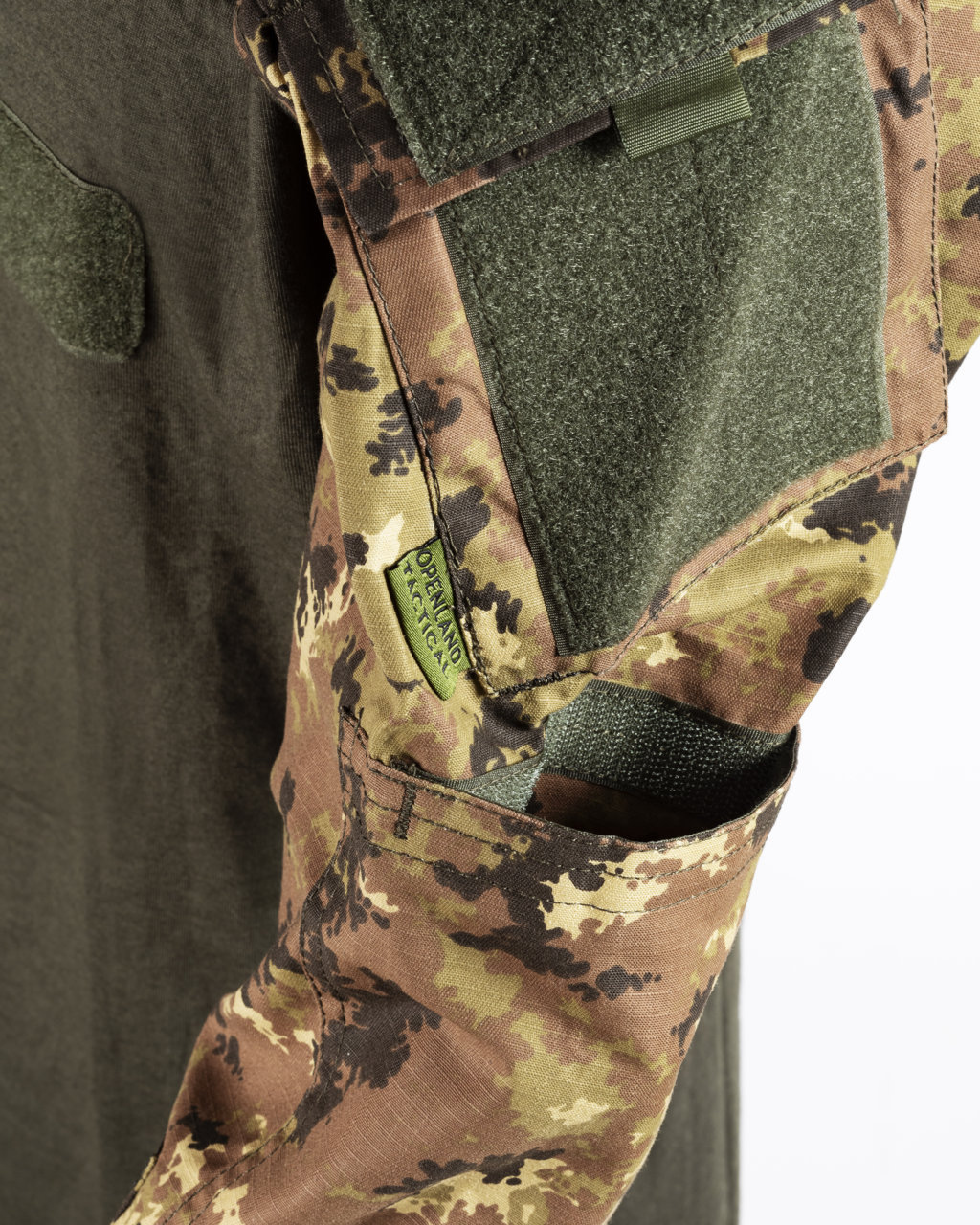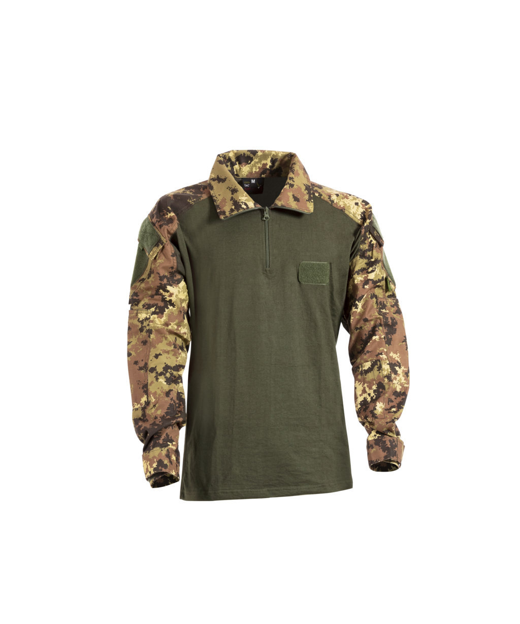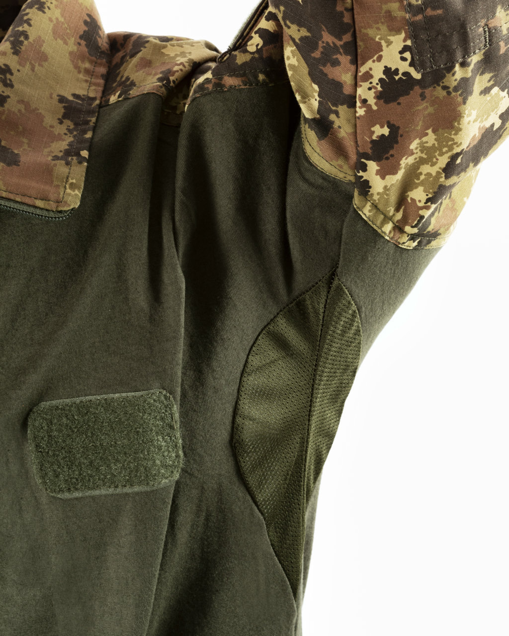 Combat shirt militare realizzata per essere indossata sotto il body armor o giacca. Fronte e retro realizzato in cotone leggermente elasticizzato, leggero e traspirante, garantendo così all’operatore una corretta traspirazione e dispersione del calore coorporeo. Il resto del tessuto invece è realizzato con 60% cotone e 40 % poliestere, per una elevata resistenza all’abrasione. Torso e schiena in cotone