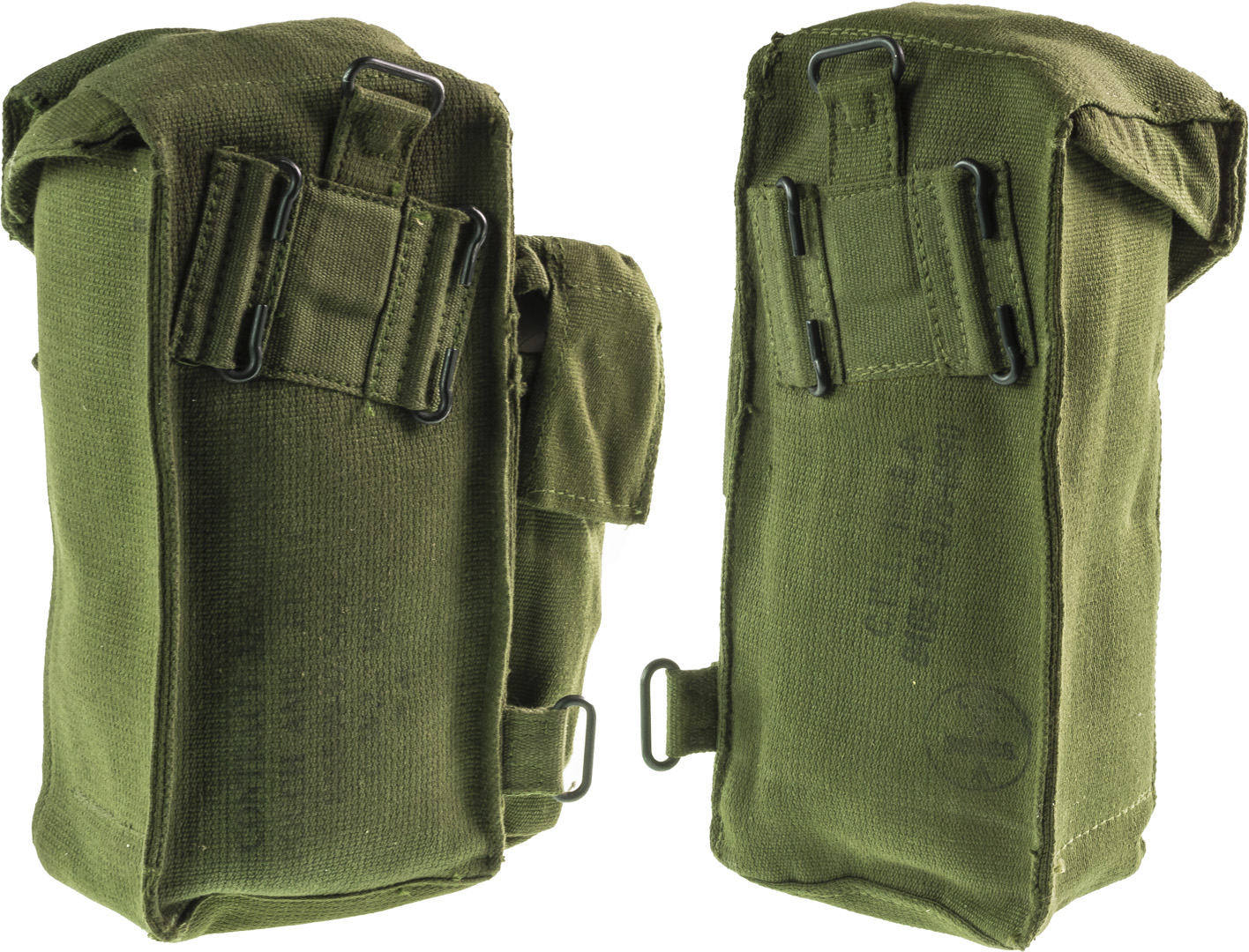 pattern web equipment portacaricatori originali inglese destro e sinistro una volta agganciati al cinturone restano leggermente obliqui usati seminuovi prima scelta prodotto in Inghilterra ex dotazione dell'esercito distribuito come equipaggiamento standard presso i reparti a partire dal 1960 ad apertura rapida woven cotton (tessuto di cotone ritorto) colore dark green (verde scuro) trattato chimicamente in modo che fosse pre-shrunked e waterproofed (pre-ristretto ed impermeabile) attacchi cinturone a c metallici anello superiore e fibbie metalliche altezza 23cm lunghezza 10cm spessore 9cm