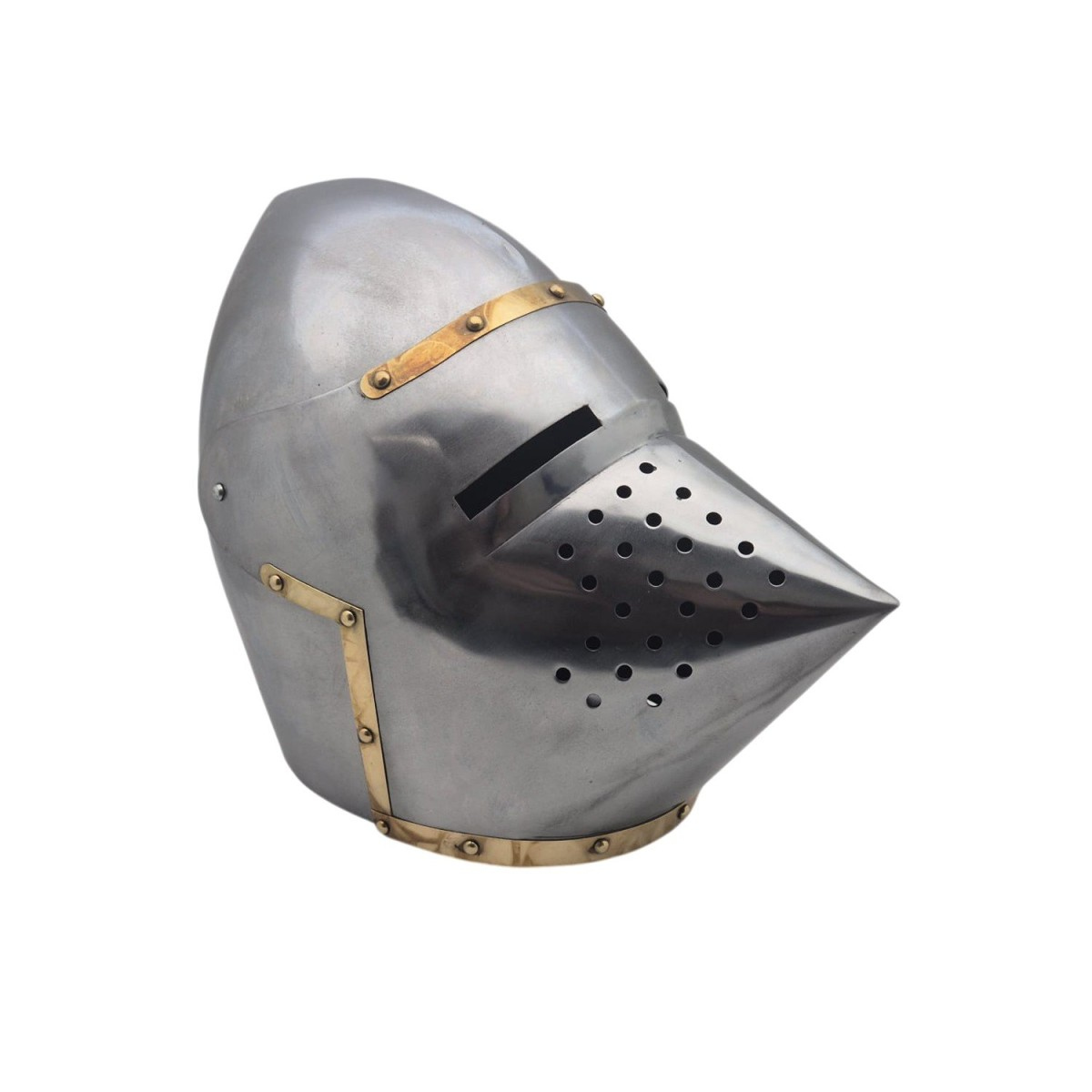 Elmo storico ispirato ai modelli in uso nel XV secolo, noto come becco di passero per la caratteristica forma appuntita della visiera, pensata per deviare i colpi delle armi da taglio e delle lance. Perfetto per collezionisti, rievocatori storici ed esposizioni.