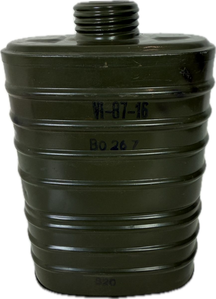 Per maschera Antigas gp4 nuovo di magazzino senza imballo per maschera antigas Esercito Sovietico interamente in metallo verde verniciato traslucido corpo con modanature in rilievo antiurto tappo in gomma sul fondo ancorato con cordino tappo a vite superiore assente N.B.(potrebbe avere piccole striature e segnetti dovuti allo stoccaggio senza involucro) NB privo di certificazioni viene venduto come pezzo inerte non per essere utilizzato 865 gr