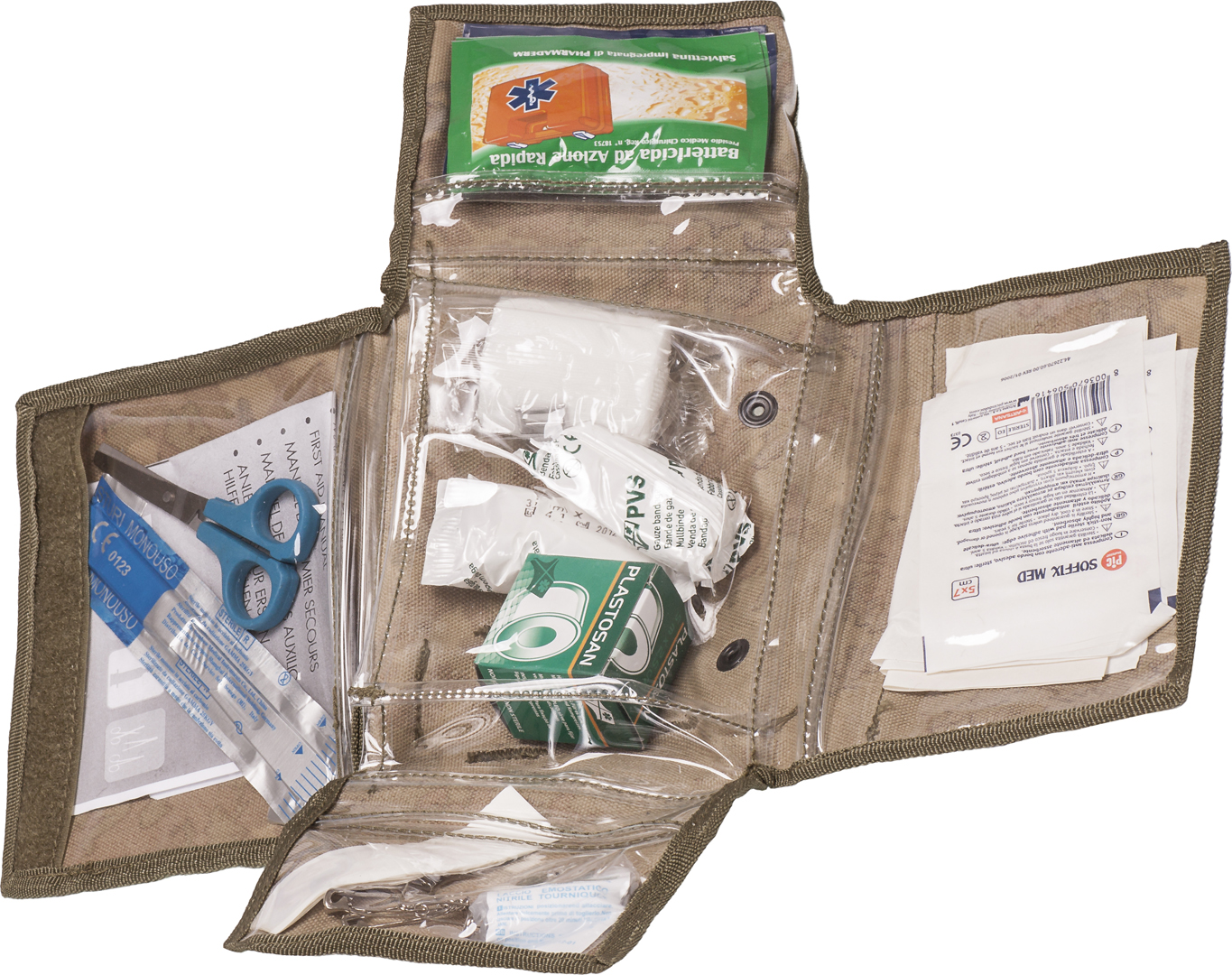 special operation nuovo contenuto: giberna guanti 1 pz manuale 1 pz forbici 1 pz laccio emostatico 1 pz salviette disinfettanti 2 pz ammoniaca 2 pz garza 1 pz bende 2 pz garza adesiva 5x7 cm 2 pz cerotto rocchetto 1 pz cerotti 5 pz spille 6 pz benda elastica 1 pz bisturi monouso 1 pz dimensioni: 18x13x4,5