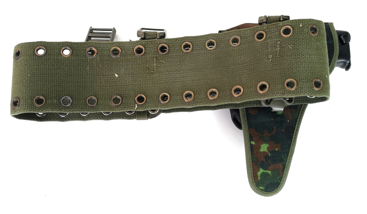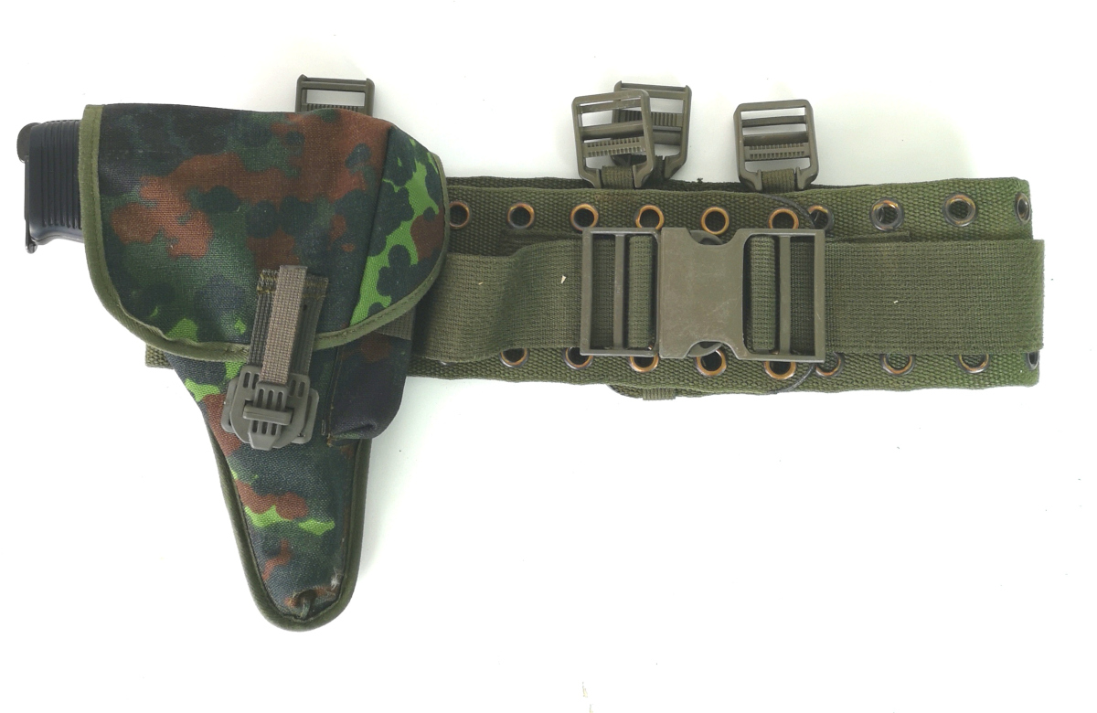 fondina nuova di magazzino originale cinturone usato prima scelta Bundeswehr per Walther p38 semiautomatica ex ordinanza Esercito Tedesco Germania Ovest in cordura impermeabile doppia chiusura clip esterna e automatico con laccetto interno parte interna semirigida porta caricatori con chiusura a nastro a strappo altezza 24 cm larghezza 16 cm colore grigio verde fibbia in polimero antiurto cinturone regolabile in lunghezza altezza 100 mm