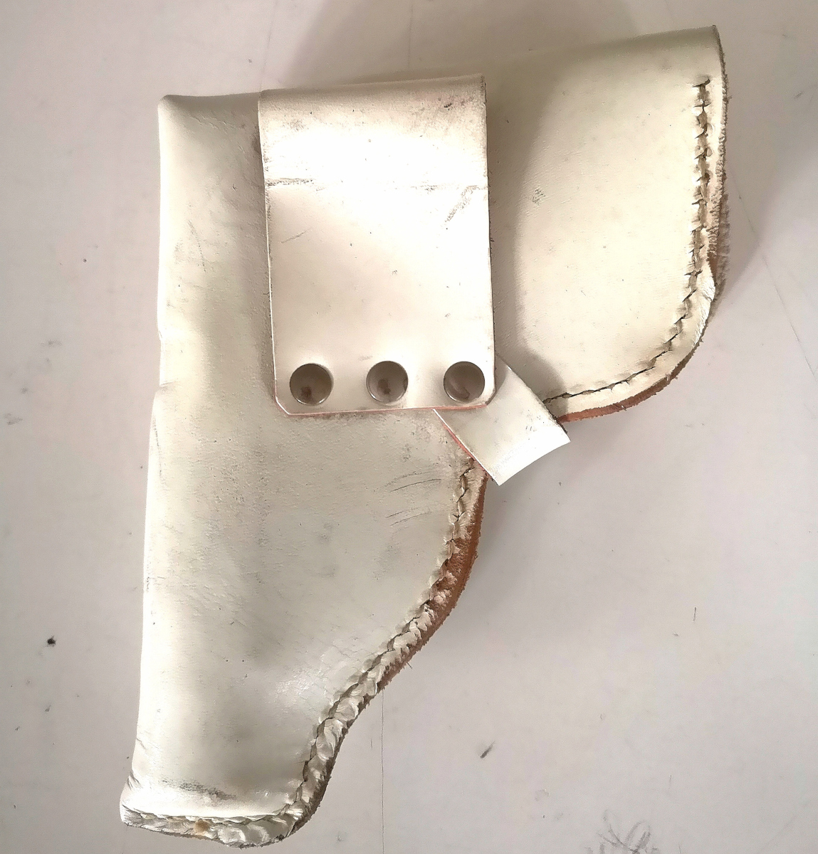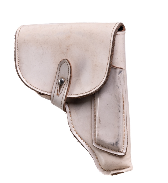 NVA "Nationale Volks Armee" Deutsche Demokratische Republik (DDR) fondina in cuoio bianca costruita per il modello semiautomatico monofilare Makarov portacaricatori cucito lateralmente Nuova di magazzino con evidenti segni di stoccaggio Originale eccedenza Marchio interno NVA Patta chiudibile a incastro con nottolinometallico due passanti per scovolo non incluso passante in cuoio per cinturone altezza 5,5 cm fissaggio passanti con tre rivetti metallici Ex dotazione anni 1980 altezza 18,5 cm larghezza 15 cm peso 125 gr