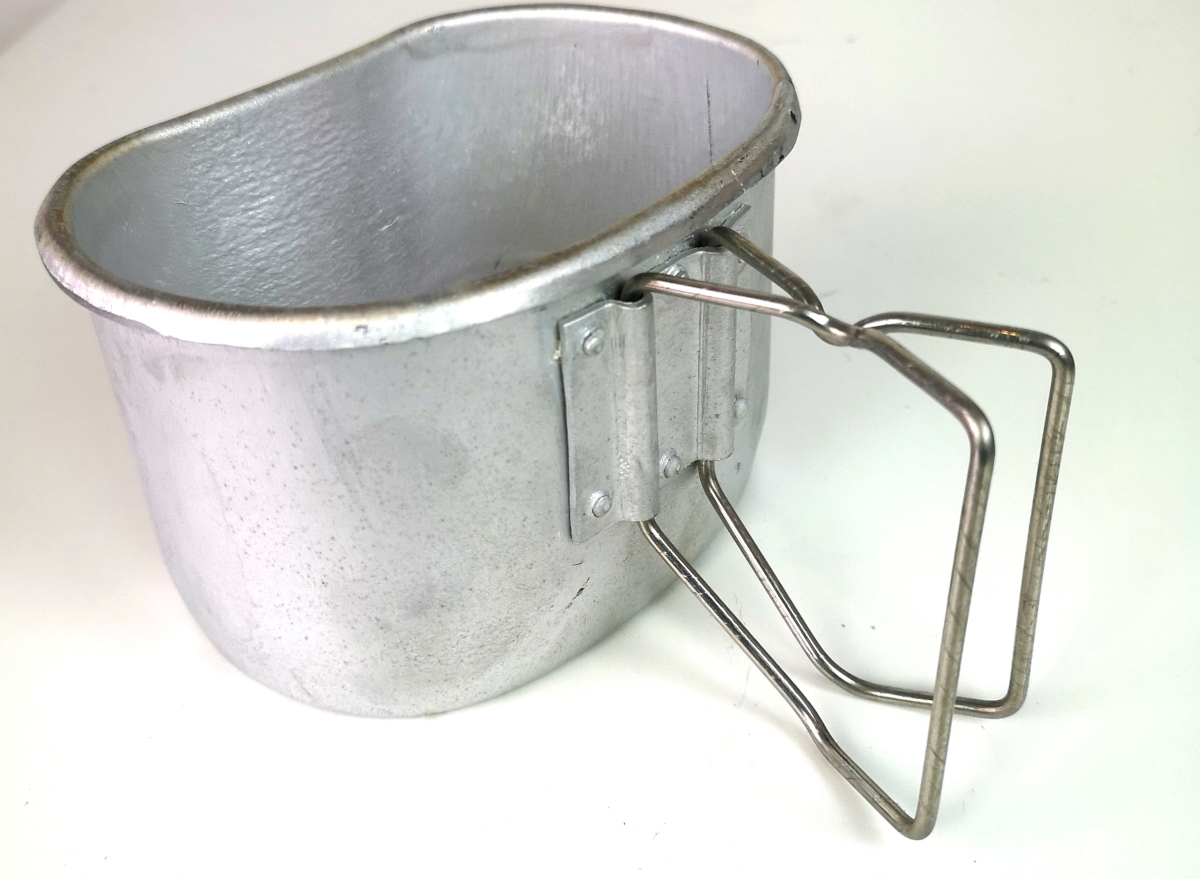 originale eccedenza Esercito Italiano nuovo interamente in alluminio Maniglie pieghevoli ingombro ridotto Basato sul modello in uso all'Esercito Americano Altezza esterna 85 mm spessore interno 86 mm larghezza interna 127 mm Volume dell'eventuale contenuto ca. 750ml colore alluminio naturale satinato peso 135 gr