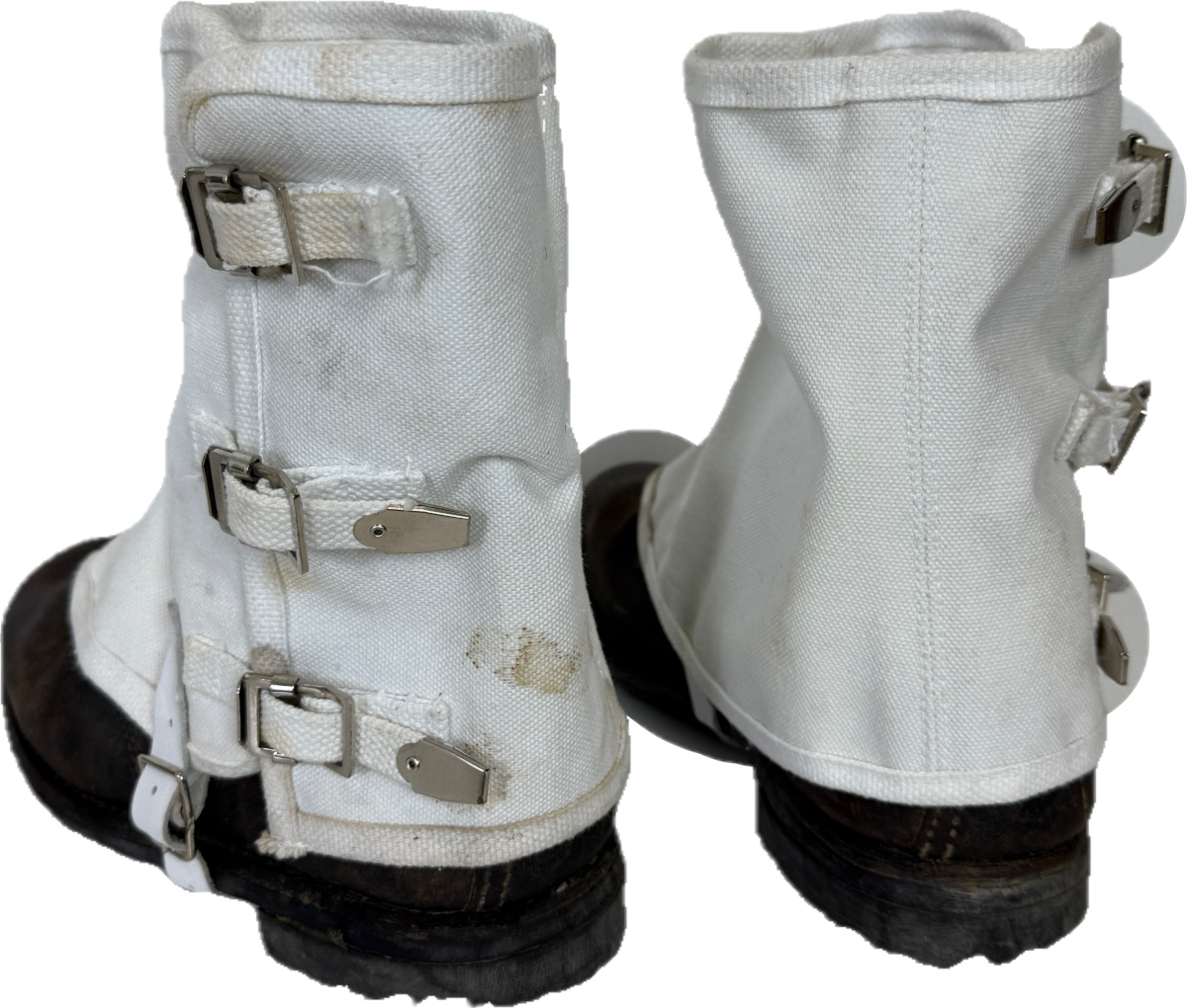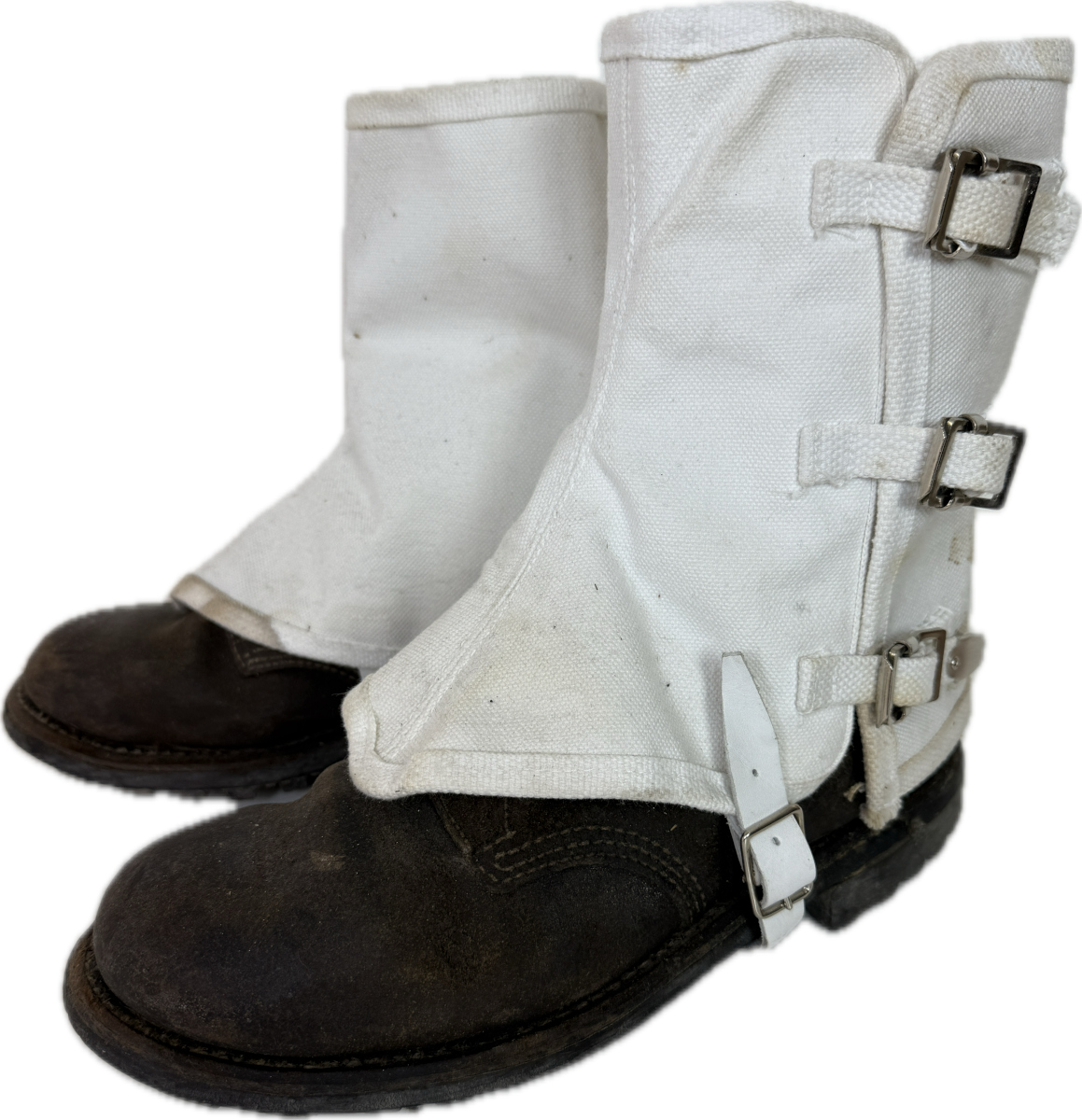 Ghette originali della Aeronautica Militare Italiana, ex dotazione storica. Realizzate in canapa naturale tinta di bianco, con struttura interna irrigidita da un listello metallico cucito per mantenere la forma. Equipaggiate con due fibbie in metallo per la chiusura e rinforzi interni in cuoio a mezzaluna.