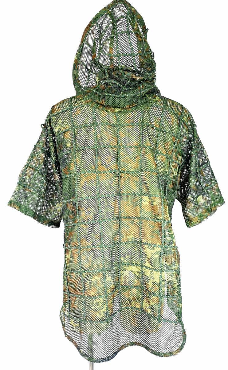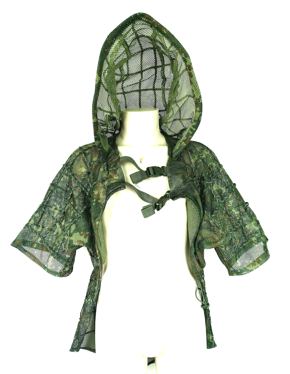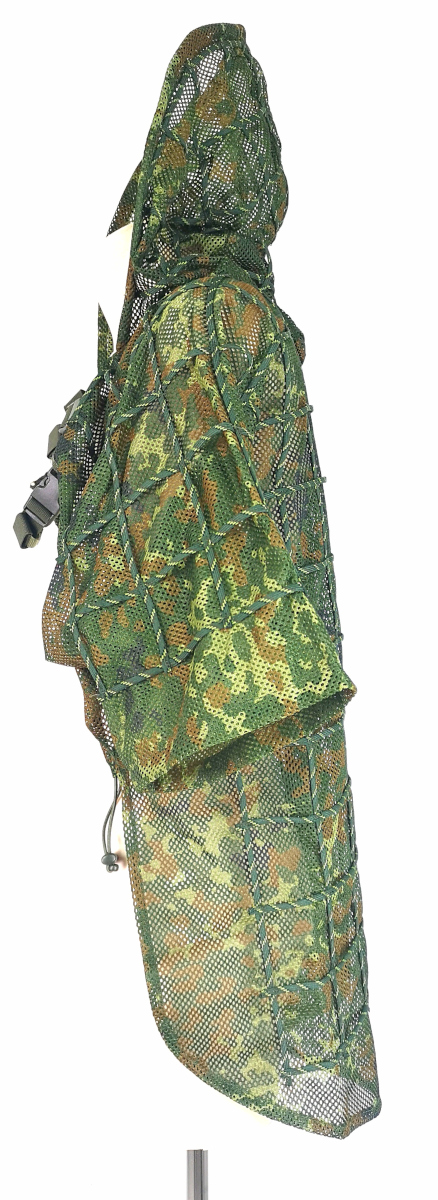 100% poliestere nuova Mantella Ghillie in taglia unica Elaborata con materiale portante a forma di griglia Il materiale mimetico può essere attaccato al materiale portante stesso Due fibbie per chiudere il mantello fermacorda su entrambi i lati nella parte anteriore per il fissaggio ampio cappuccio con bordi in filo metallico Sezione posteriore estesa ampie maniche per una rapida vestizione taglia unica regolabile fino a 140 cm di giro torace peso 325 gr
