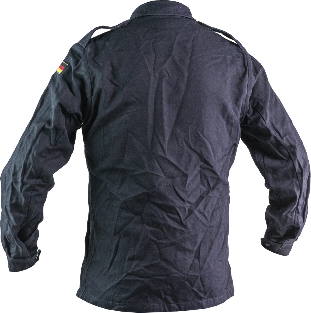 originale Bundeswehr ex dotazione Germania ovest occidentale anni 1980/1990 surplus militare colore blu scuro N.B. cerniera lampo rotta seconda scelta in robusto tessuto 65% viscosa 35% aramidica chiusura centrale doppia con cerniera lampo 2 tasche frontali superiori con zip 2 inferiori diagonali 2 tasche interne 3 fori ascellari d'areazione bandiere cucite lateralmente originale non ricondizionata spalline con bottoni polsino regolabile con automatici ottima vestibilità aderente sul punto vita ideale anche per donna peso 630 gr