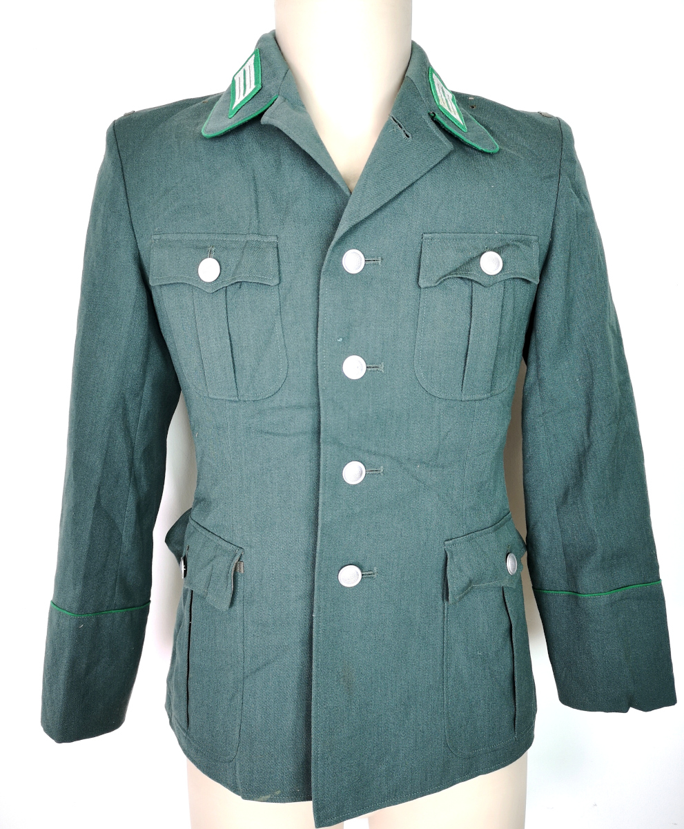 originale ex dotazione D.D.R. -N.V.A. anni 80 Germania Est NVA "Nationale Volks Armee" Deutsche Demokratische Republik (DDR) nuova di magazzino originale prodotta in Germania Est bottoni in metallo 4 tasche anteriori una tasca interna portadocumenti un taschino interno porta pacchetto di medicazione foderata internamente colore verde NB: qualche giacca potrebbe avere mostreggiature cucite composizione 50% lana 50% cotone è un tessuto di peso medio dall’aspetto granulare ingualcibile, poroso e resistente peso 895 gr