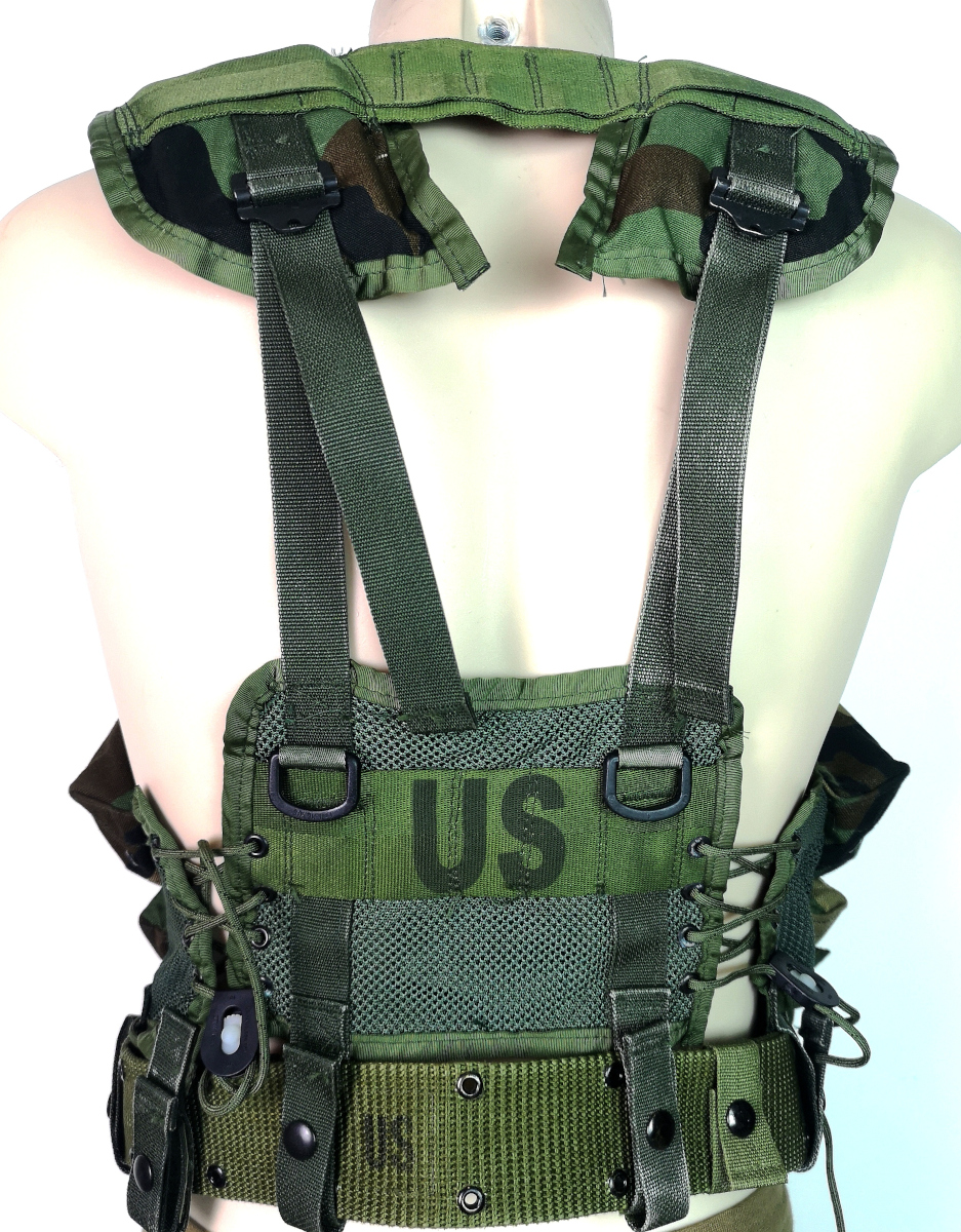 usato prima scelta Colore woodland originale anni 1990 Esercito Americano Taglia unica regolabile in altezza e larghezza Parte anteriore in rete di cordura traspirante 4 porta caricatori per serie Colt e 2 porta-granate in posizione bassa Tasche chiudibili tramite nastro a strappo e bottone automatico Cinghie anteriori e posteriori Lacci laterali elastici. 2 fibbie frontali 6 attacchi per cinturone Spallacci imbottiti cinturone originale ex dotazione Esercito Americano anni 1990 peso gr 950 Cinturone Us Army Esercito Americano originale surplus militare usato surplus militare ex dotazione us army anni 1990 2000 modello 1991 in cordura taglia large 85-125 cm taglia medium 85-115 cm 2 blocchi metallici per regolarlo altezza 5,8 cm