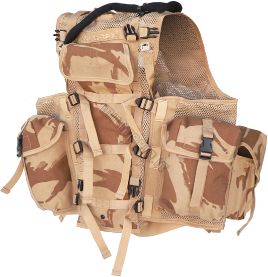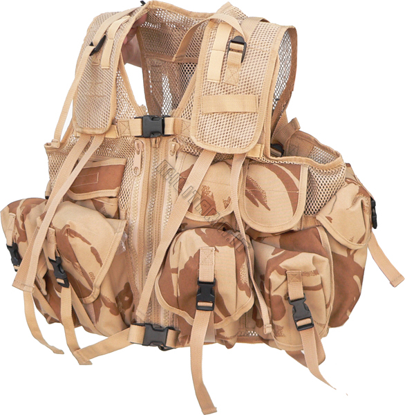 Combat Vest in DPM Desert Caratteristiche Tecniche Costruito in cordura 1000 denari 4 Tasche portacaricatori 2 Tasche piccole 2 Tasche grandi Tasca porta Mag-Lite Tasca multi-Tool Larga tasca interna portamappa Larga tasca interna con fondina Tasca posteriore per Camel Back Camelback da 1,5 litri con tubo in neoprene incluso Chiusura in nastro a strappo per adattarlo sulle spalle Cinturone incluso