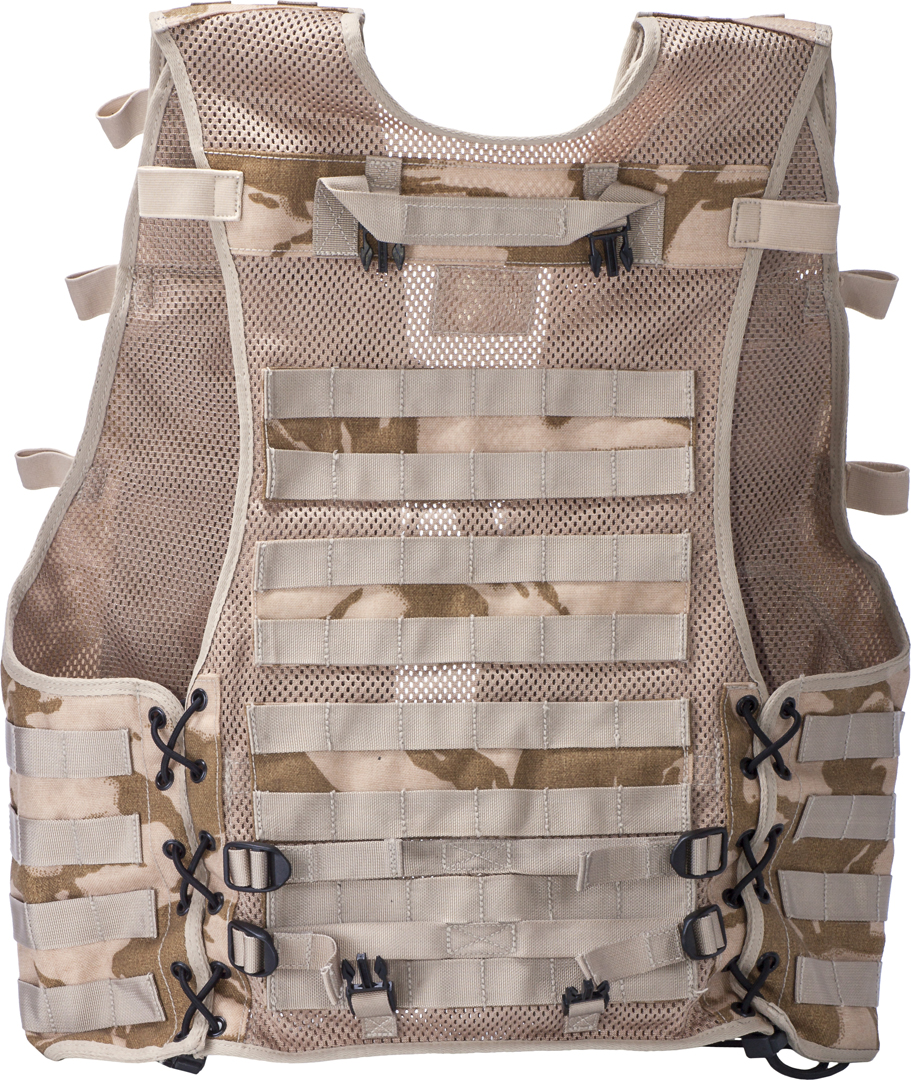 tactical vest modello 2007 dpm inglese desetico originale ex dotazione brithis army nuovo da surplus militare realizzato in robusta tela di cordura 500 den e rete di nylon traspirante maniglia di trasporto superiore misura regolabile in altezza e larghezza tramite nastro a strappo e cinghie
