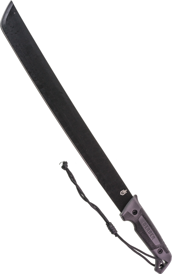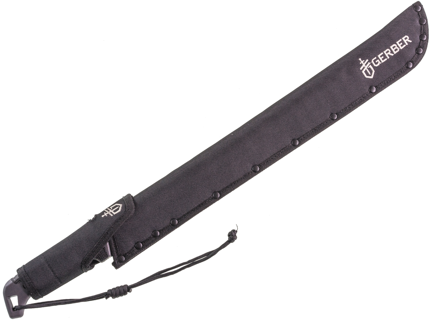 Gerber Fodero in nylon con apertura a nastro a strappo e passante per cinturone Impugnatura in gomma tattile con cordino Lama in acciaio inox nero antiriflesso Lunghezza Lama: 465 mm Spessore Lama: 3 mm Lunghezza Totale: 610 mm Peso: 530 g