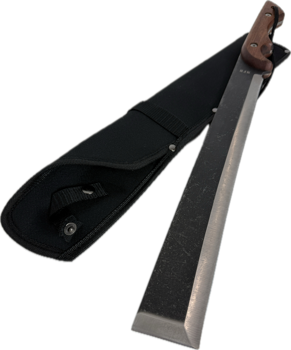 lama stonewashed in acciaio 3Cr13MoV con macinazione liscia estremità della lama dritta con molatura liscia bilancia con manico in legno avvitato Le venature e il colore del legno possono variare! dalla forma ergonomica Fodero in nylon con passante per cintura (circa 5 cm) Occhiello con cordino all'estremità del manico Lunghezza totale: circa 47 cm Lama: ca. 31,5 centimetri Spessore della lama: ca. 4 mm Peso con fodero: ca. 640 grammi