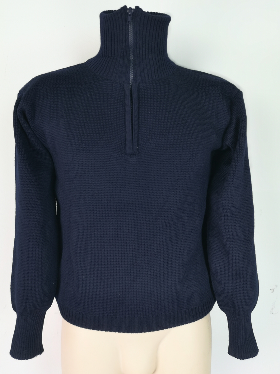 originale Surplus Militare ex dotazione anni 1990 Aeronautica Militare Italiana capo nuovo colore blu scuro collo alto chiusura collo a cerniera lampo polsini elasticizzati girovita elasticizzato vestibilità attillata prodotto in Italia su capitolato militare composizione vera lana 100% peso 630 gr taglia=S (1) torace=51*2=100 lunghezza=74