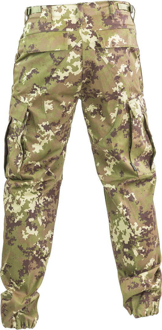 Battle Dress Uniform tessuto rip stop articolo nuovo tessuto nyco 35% cotone 65% polyestere chiusura anteriore dotata di 5 bottoni protetti 6 tasche di cui le due basse laterali posteriori dotate di 2 bottoni girovita regolabile con due cinghiette altezza passanti 6 cm fondo e ginocchia rinforzati con doppio strato di stoffa peso 700 gr misure in cm Girovita: S 78cm M 86cm L 98cm XL 106cm XXL 116cm