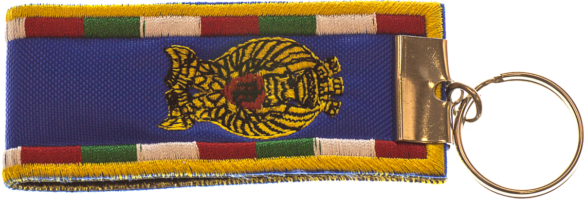 a nastro di cordura ricamato attacco con anello in metallo lucido diametro anello 2,8 cm lunghezza totale 12 cm altezza nastro 3,2 cm peso 15 grammi