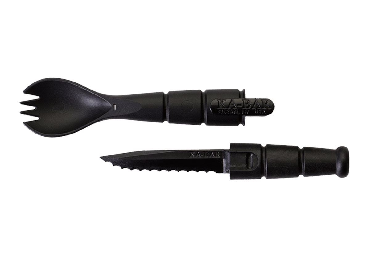 prodotto con Grilamid approvato per alimenti e acqua dotato di una combinazione di forchetta / cucchiaio e ha un coltello seghettato da 12,7 cm nell'impugnatura
