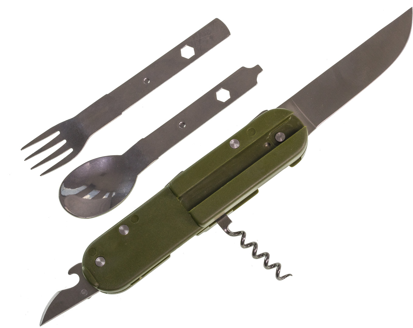 Coltello multiuso da campo Composto da: Lama Cucchiaio Forchetta Cavatappi Apribottiglie Posate in acciaio 420 Fodero in cordura con passante per cintura
