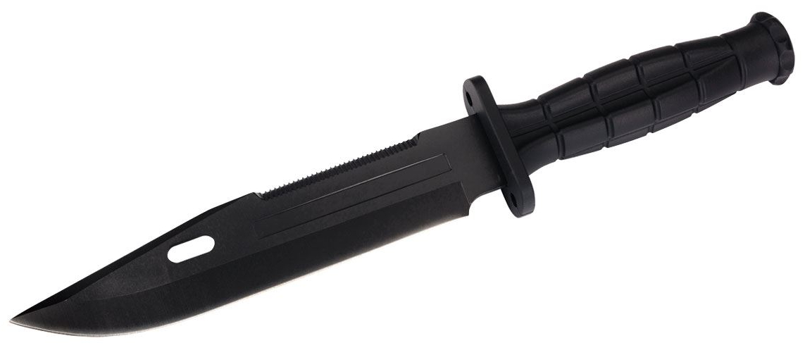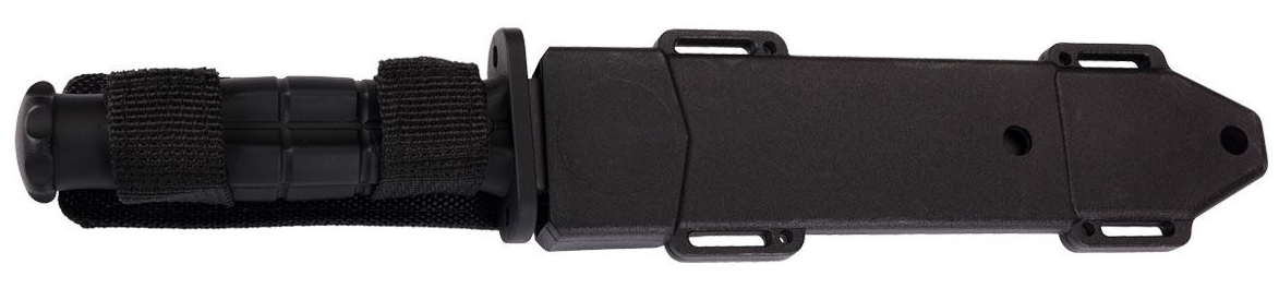 Lama in acciaio AISI 420 nero antiriflesso Foro e zigrinatura sul lato superiore della lama Impugnatura in gomma antiscivolo Lunghezza lama: 180 mm Spessore lama: 3 mm Lunghezza totale: 300 mm Fodero in polimero con doppia chiusura a nastro a strappo e passante per cinta Possibilità di fissaggio sulla gamba
