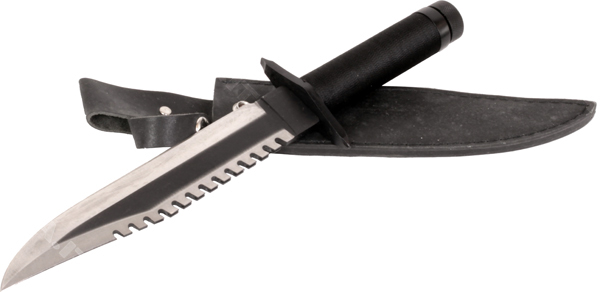 lama in acciaio 440 teflonata dorso seghettato passante alto 5 cm per metterlo in cintura lunghezza lama 225 mm spessore lama 5,5 mm manicatura in alluminio concava con rilegatura nera contenente accessori e bussola lunghezza manicatura 105 mm lunghezza totale 360 mm guardia in metallo pomolo in metallo contenente bussola peso 450 gr fodero in cuoio nero