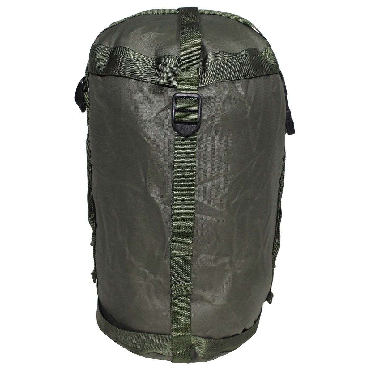 sacca di compressione per sacco a pelo small originale ex dotazione inglese anni 2000 usata pari al nuovo colore verde scuro in nylon impermeabile quattro cinghiette in cordura di contenimento regolabili apertura chiudibile tramite laccetto con cursore dimensioni circonferenza 175 mm altezza 355 mm peso 175 grammi