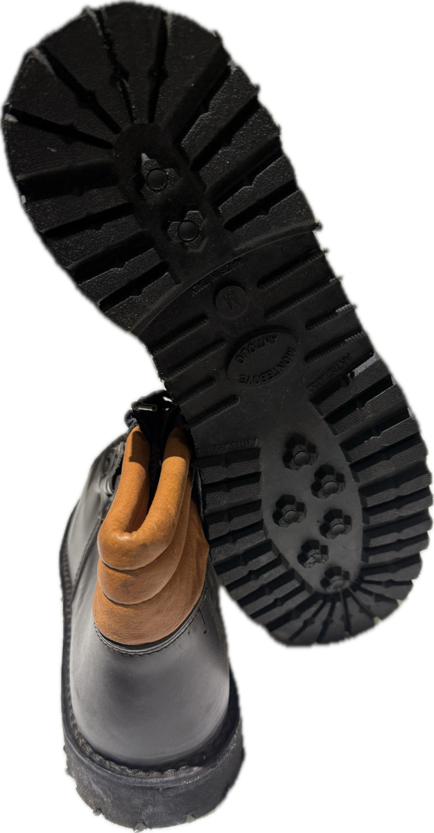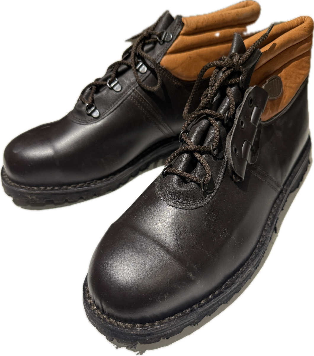 Robusto scarpone da lavoro interamente in pelle marrone scuro, realizzato artigianalmente in Italia. Modello di alta qualità, proveniente da rimanenze di magazzino destinate al mercato estero. Non certificabile, ma costruito con materiali e finiture di livello professionale.