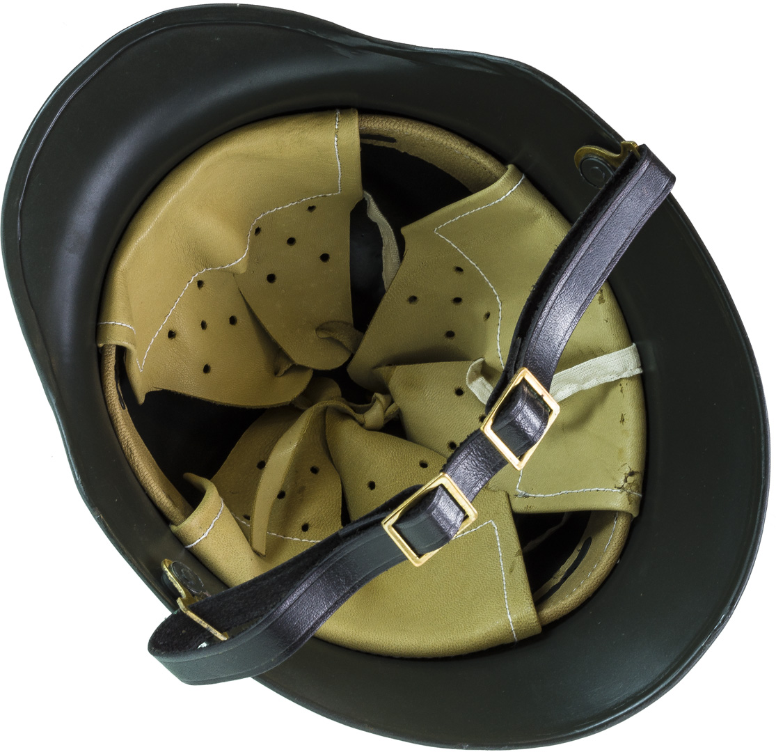 nuovo replica fedele della prima guerra mondiale interamente in metallo verniciato opaco interni in cuoio naturale regolabili con laccetto soggolo in cuoio nero con ganci metallici