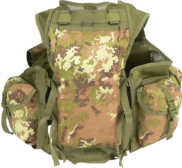 Vegetato Realizzato in robusta tela di cordura 500 den e rete di nylon traspirante Maniglia di trasporto superiore 4 anelli metallici superiori Taglia unica regolabile in altezza e in larghezza mediante cinghie e nastro a strappo Dotato di 4 tasche portacaricatori con chiusura a nastro a strappo e due fastex 2 tasche laterali con chiusura a nastro a strappo e fastex 3 taschine superiori 2 chiuse a nastro a strappo e 1 a automatico Apertura e chiusura anteriore con zip, nastro a strappo e bottoni a pressione 2 tasche portamappe anteriori apribili a cerniera Tascone dorsale porta sacca idratante (non inclusa ) chiuso a nastro a strappo Peso 1000 gr