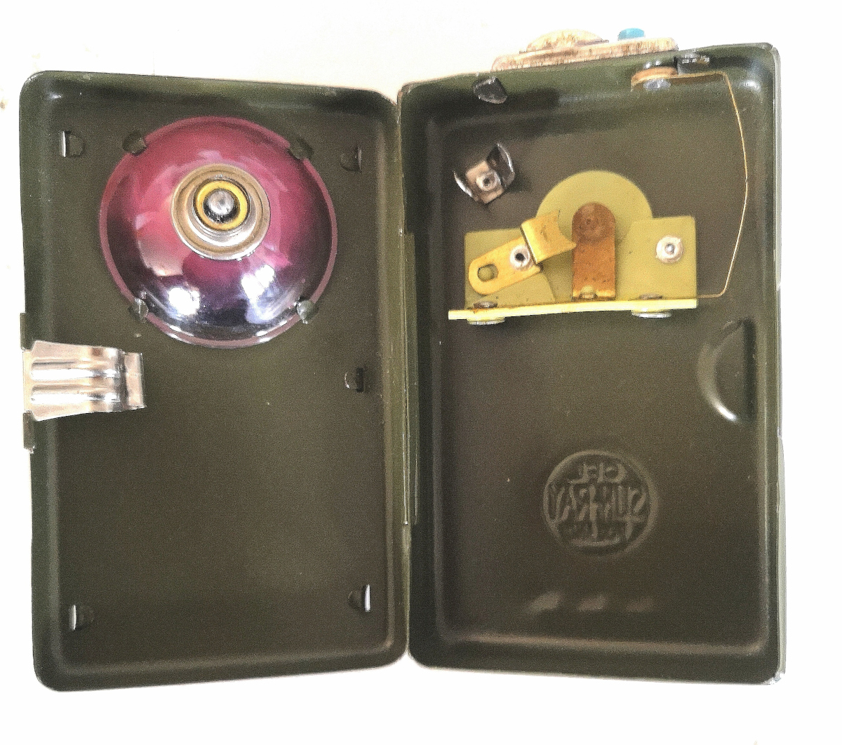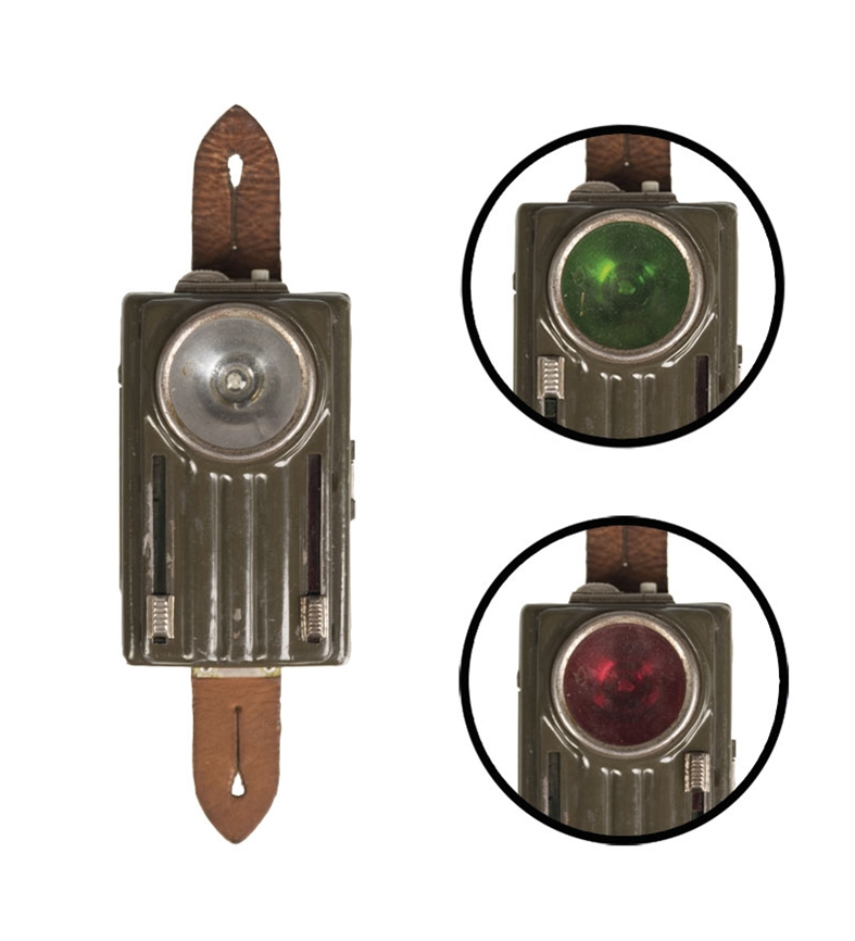 nuovo ex dotazione Wojska Lądowe Rzeczypospolitej Polskiej ex dotazione Esercito Polacco anni 1970 1980 in lamierino metallico stampato colore verde kaki apertura a libretto pulsante per segnalare interruttore metallico scorrevole chiusura con clip metallica fettuccia in pelle per agganciarla al bottone della giacca doppia serrandina colorata verde rossa azionata a mano tramite cursore laterale NB: Batterie non incluse peso 130 gr