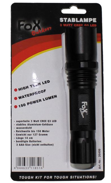 Corpo in alluminio 150 lumen Raggio d'azione: 150 metri Resistente all'acqua Funziona con 3 batterie alcaline AAA (NON INCLUSE) Lunghezza: 145 mm Diametro corpo: 25 mm Diametro bulbo: 35 mm Peso: 127 g