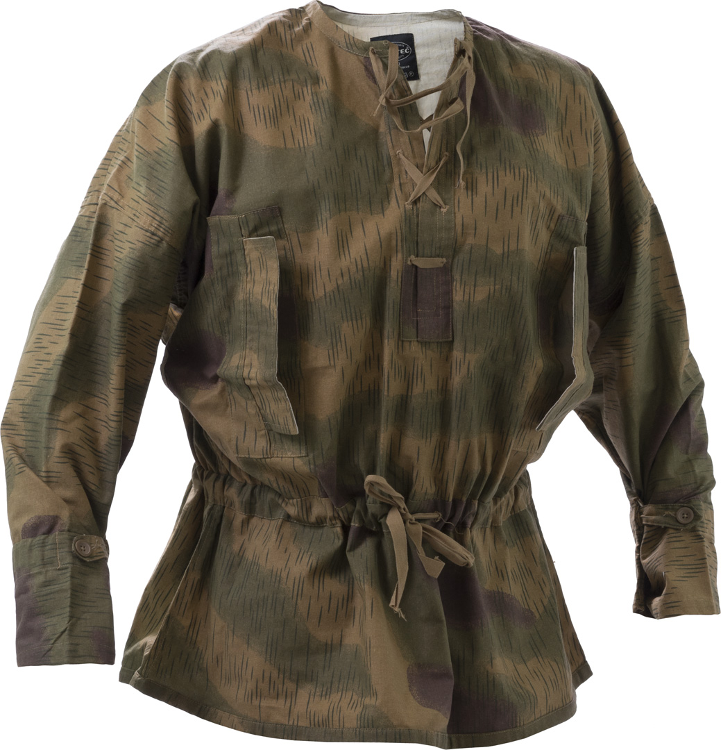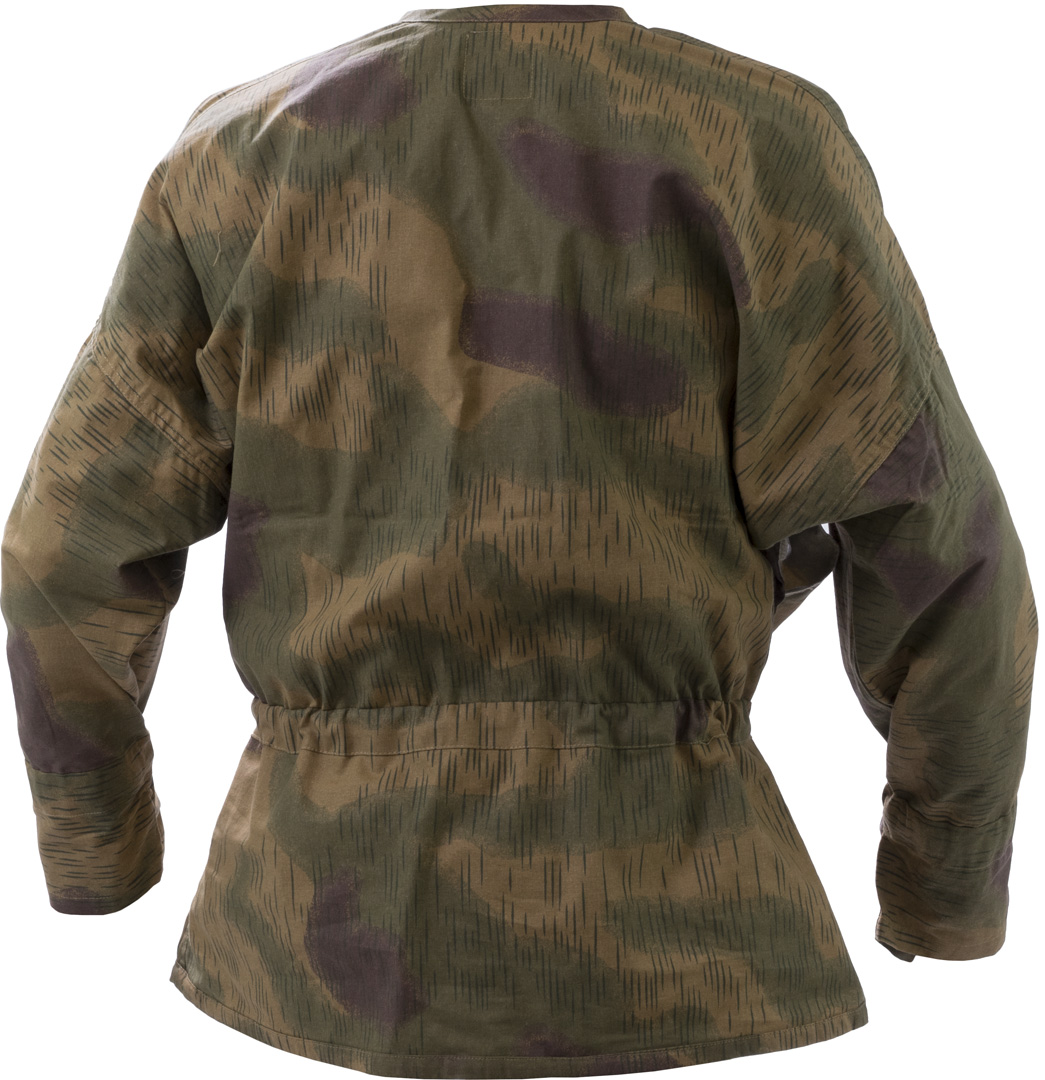 WWII German infantry Nuovo riprodotto fedelmente Blusa mimetica leggera Vestibilita' ampia Polsini chiusi da fettuccia con due bottoni Coulisse in vita per stringerlo Apertura frontale tramite laccio Aperture laterali ascellari di areazione Mimetismo usatosurplus militare dai tedeschi durante la seconda guerra mondiale. 100% cotone Taglia 1 120 cm girotorace Taglia 2 130 cm girotorace Taglia 3 140 cm girotorace Peso 485 gr