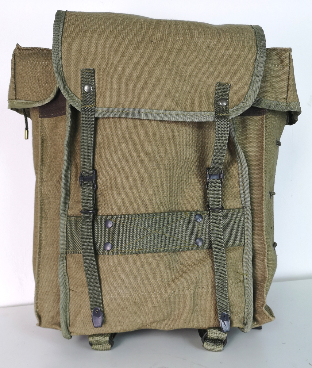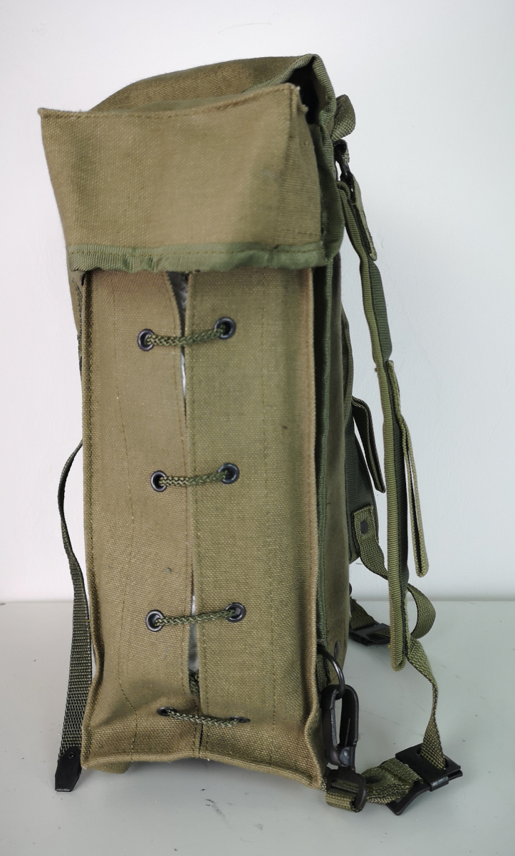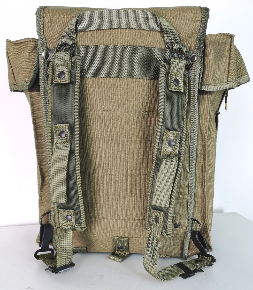 nuovo di magazzino prodotto da metà anni 70 fino al 1996 in canapa tasche laterali chiuse con nastro a strappo tessuto antimuffa tre scomparti uno centrale due laterali completo di cordoncini laterali cordoncino superiore per chiuderlo incluso fibbie metalliche maniglione di trasporto spallacci regolabili cinghiette sul fondo per agganciare il telo tenda passante sul dorso per il B.A.L.(badile articolato leggero) non incluso interamente gommato all'interno per renderlo resistente agli aggressivi NBC capienza 15 litri peso 1600 gr
