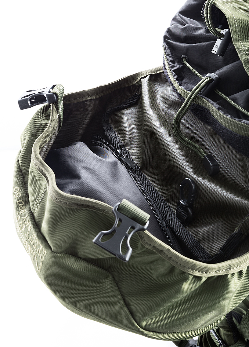 • Una di queste tasche è un marsupio, amovibile, fissato allo zaino con nastri a strappo e riposizionabile anche esternamente, sotto il cappuccio per essere a portata di mano senza dover aprire lo zaino.