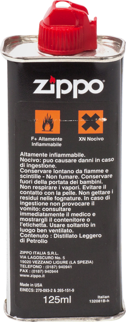 fluido di ricarica distillato di petrolio tanichetta in metallo lamierino made in usa. inodore, migliora l'accensione e la durato del tuo zippo: per preservare le condizioni originali acquista solo benzina e gas originale zippo avvertenze previste dalla legge stampate in italiano sul retro del contenitore beccuccio reclinabile antiperdita
